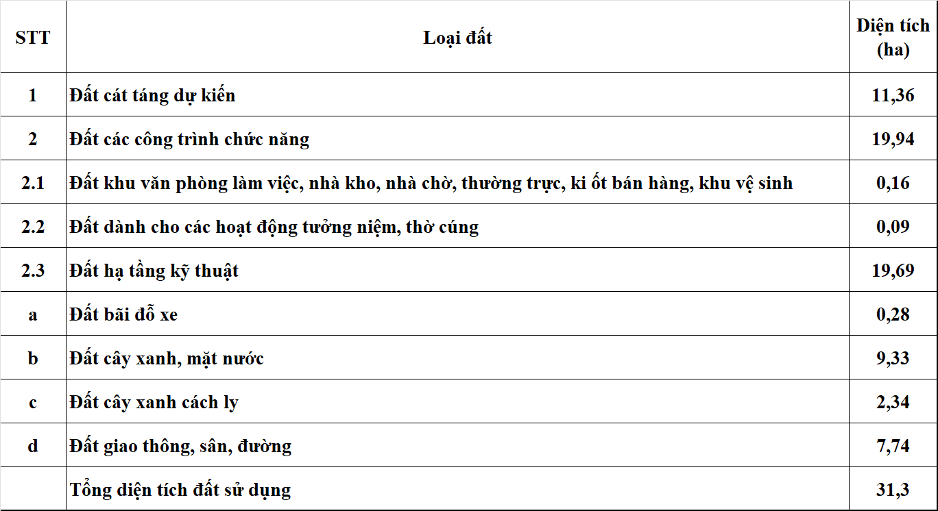 Diện tích sử dụng đất cho các khu chức năng chính theo quy hoạch được duyệt, cụ thể: