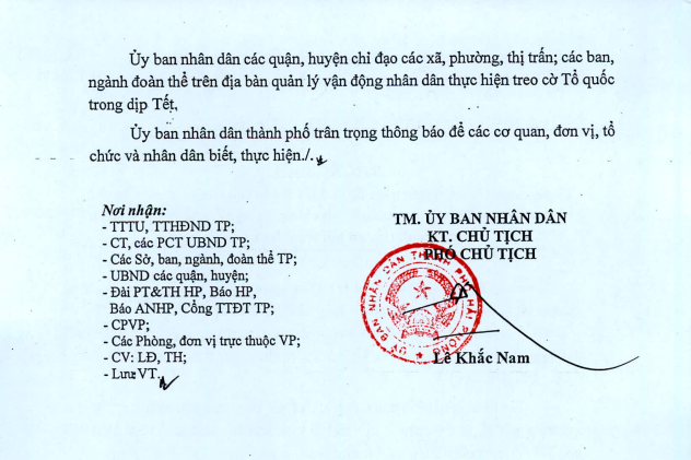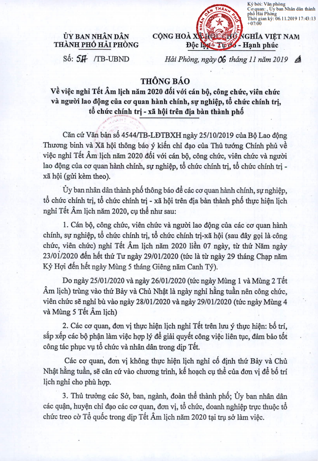 Ủy ban nhân dân thành phố có Thông báo số 517/TB-UBND ngày 06/11/2019 về việc nghỉ Tết Âm lịch năm 2020 đối với cán bộ, công chức, viên chức và người lao động của cơ quan hành chính, sự nghiệp, tổ chức chính trị, tổ chức chính trị – xã hội trên địa bàn thành phố Hải Phòng.