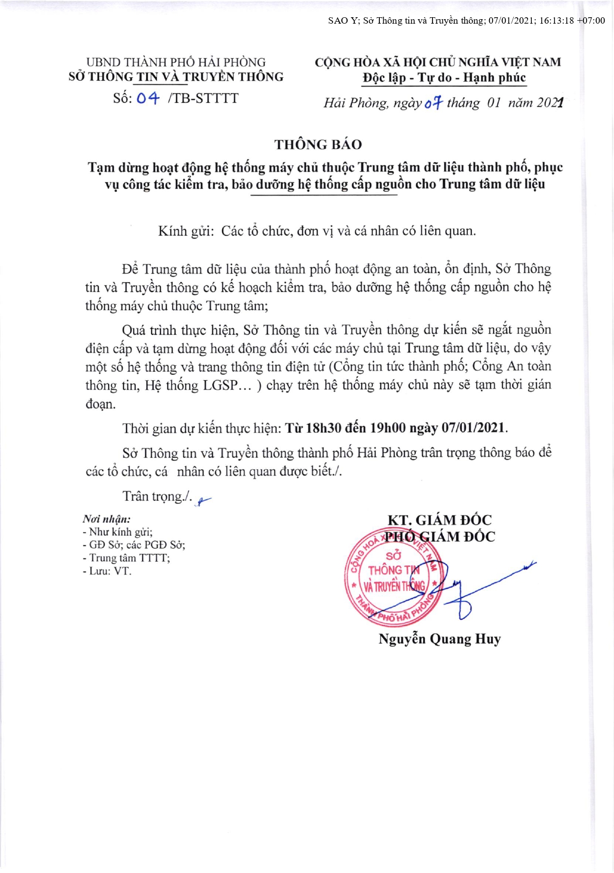 Để Trung tâm dữ liệu của thành phố hoạt động an toàn, ổn định, Sở Thông tin và Truyền thông vừa có Thông báo số 04/TB-STTTT ngày 07/01/2021 về việc tạm dừng hoạt động hệ thống máy chủ thuộc Trung tâm dữ liệu thành phố, phục vụ công tác kiểm tra, bảo dưỡng hệ thống cấp nguồn cho Trung tâm dữ liệu.