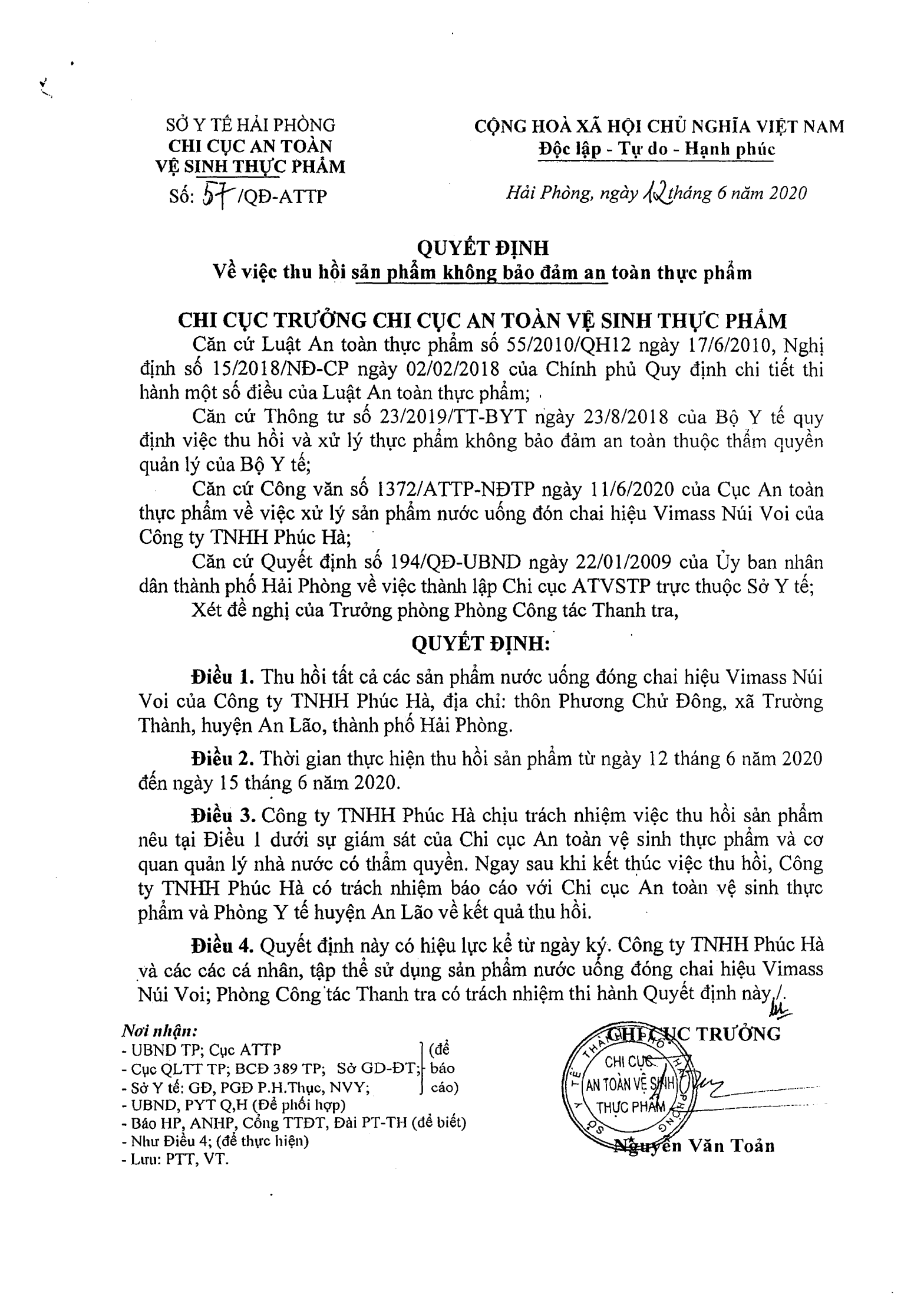 Thực hiện Công văn số 1372/ATTP-NĐTP ngày 11/6/2020 của Cục An toàn thực phẩm về việc xử lý sản phẩm nước uống đóng chai hiệu Vimass Núi Voi của Công ty TNHH Phúc Hà; căn cứ tình hình thực tế Công ty TNHH Phúc Hà sản xuất sản phẩm nước uống đóng chai hiệu Vimass Núi Voi không có giấy chứng nhận cơ sở đủ điều kiện an toàn thực phẩm, chưa có bản tự công bố sản phẩm; Chi Cục An toàn thực phẩm – Sở Y tế đã ra Quyết định số 57/QĐ-ATTP ngày 12/6/2020 về việc thu hồi sản phẩm không bảo đảm an toàn thực phẩm.