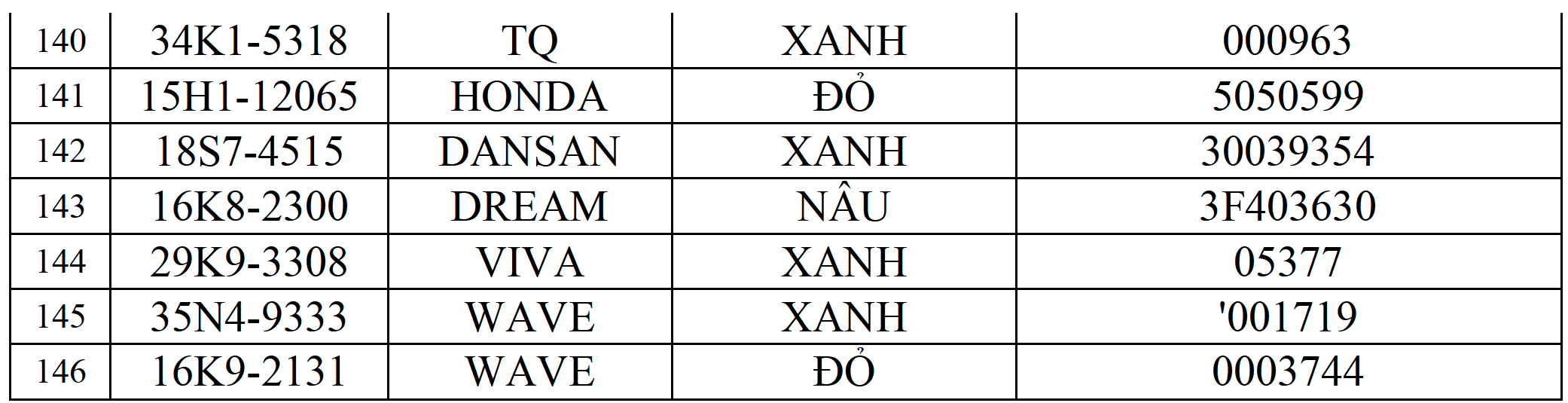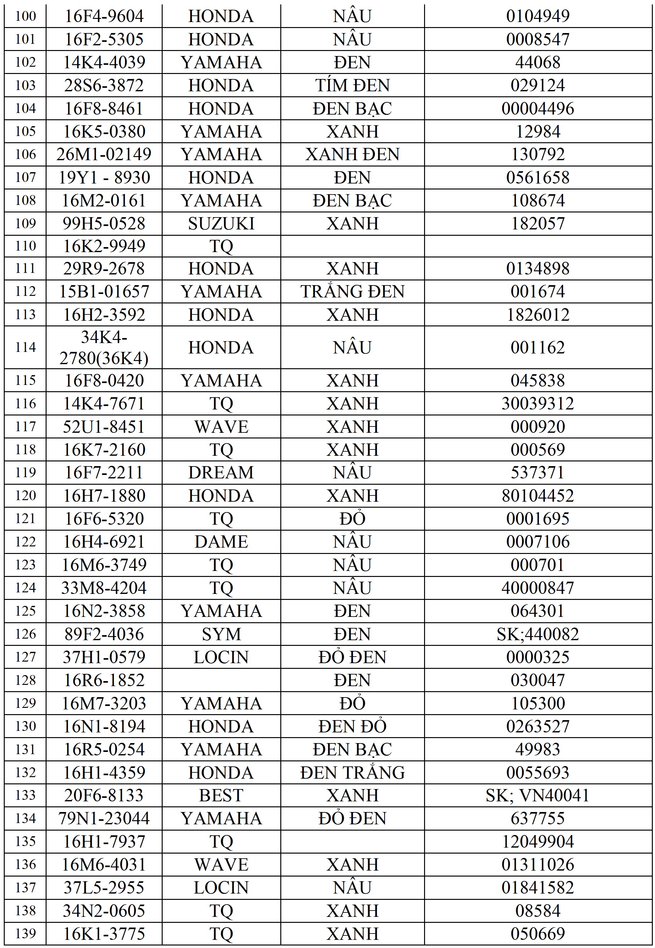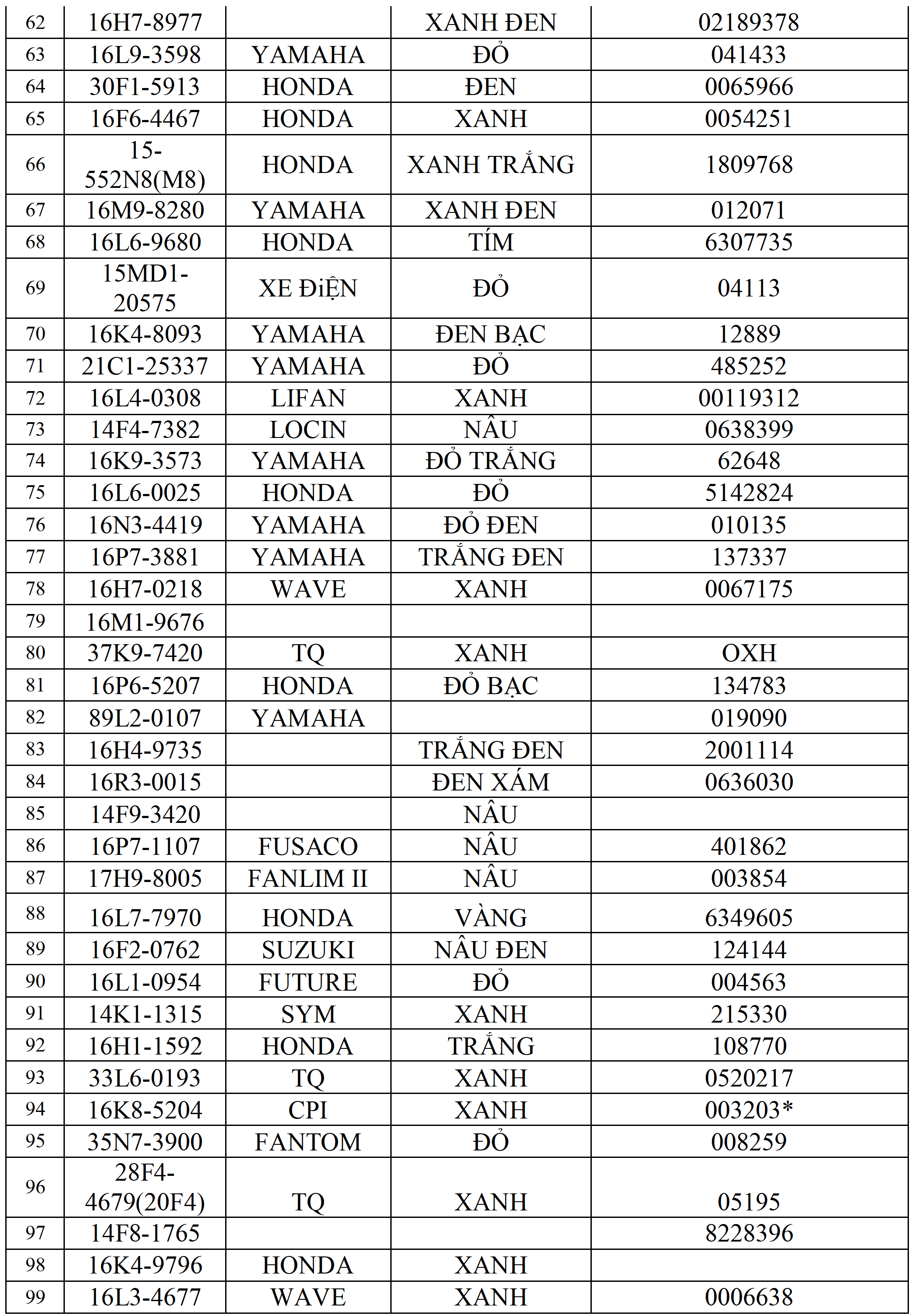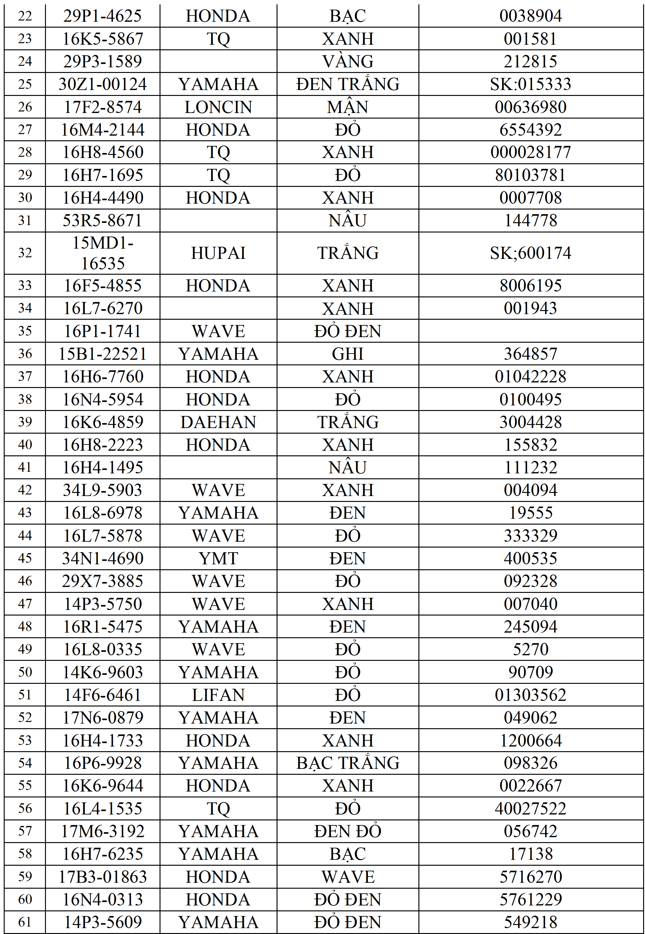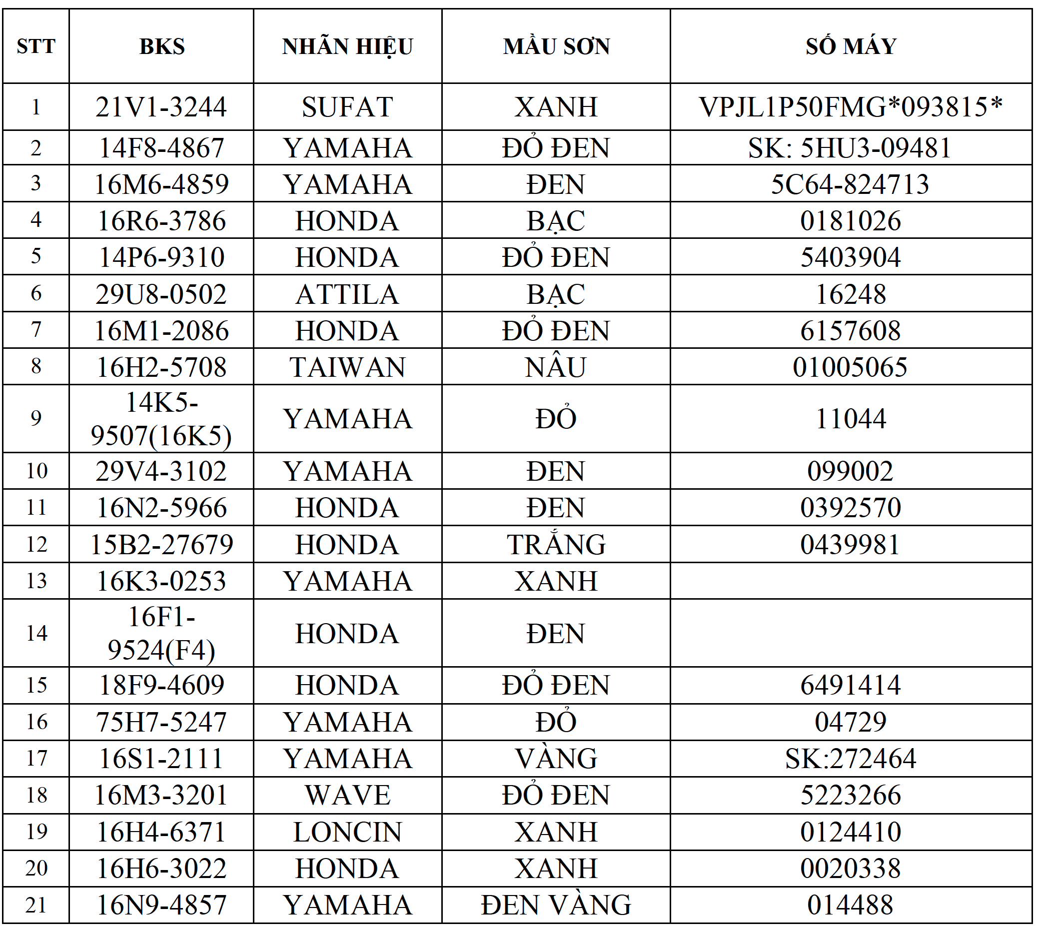 Phòng Cảnh sát giao thông đường bộ-đường sắt, Công an Thành phố Hải Phòng thông báo: Ai là chủ sở hữu hoặc có liên quan đến 146 phương tiện vi phạm hành chính về TTATGT đang bị tạm giữ mang đầy đủ giấy tờ hợp lệ (Đăng ký xe + Chứng minh nhân dân hoặc Căn cước công dân) đến Phòng Cảnh sát giao thông đường bộ-đường sắt, Công an Thành phố Hải Phòng; Địa chỉ: Số 14 Phan Chu Trinh, Hồng Bàng, Hải Phòng để giải quyết.