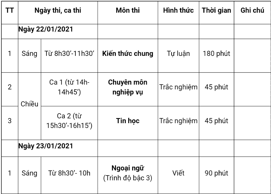 – Từ 8 giờ 30 phút ngày 22/1/2021 đến hết sáng ngày 23/1/2021: Tổ chức thi các môn thi theo chức danh nghề nghiệp viên chức.