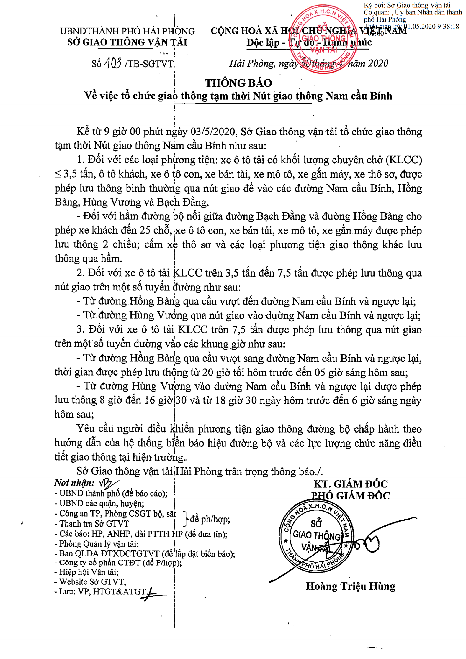 1. Đối với các loại phương tiện: xe ô tô tải có khối lượng chuyên chở (KLCC) ≤ 3,5 tấn, ô tô khách, xe ô tô con, xe bán tải, xe mô tô, xe gắn máy, xe thô sơ được phép lưu thông bình thường qua nút giao để vào các đường Nam cầu Bính, Hồng Bàng, Hùng Vương và Bạch Đằng.