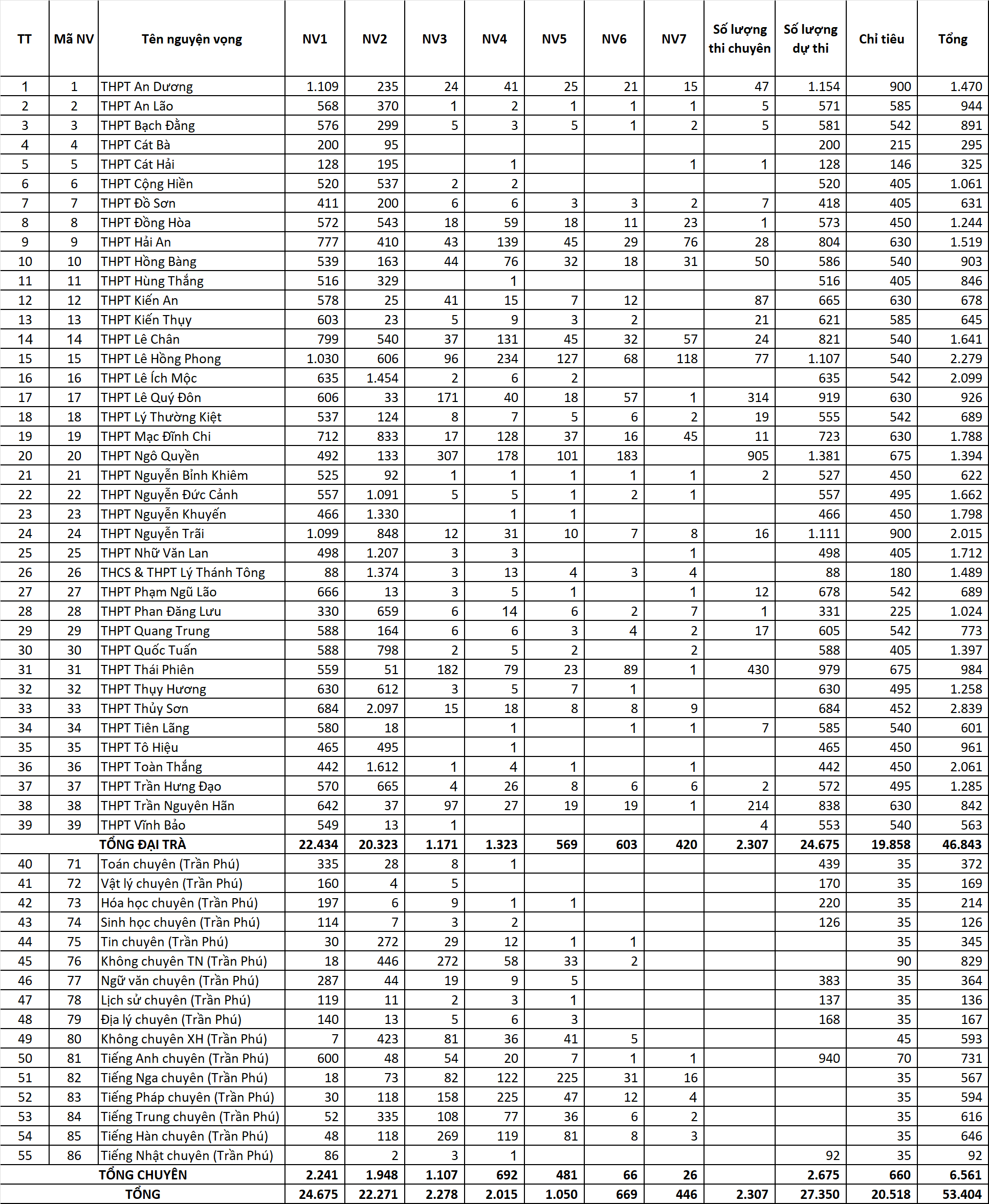 Thống kê của Sở Giáo dục và Đào tạo về số lượng thí sinh đăng ký dự thi tuyển sinh vào lớp 10 THPT năm học 2023-2024, tính đến 16h30 ngày 10/5/2023.