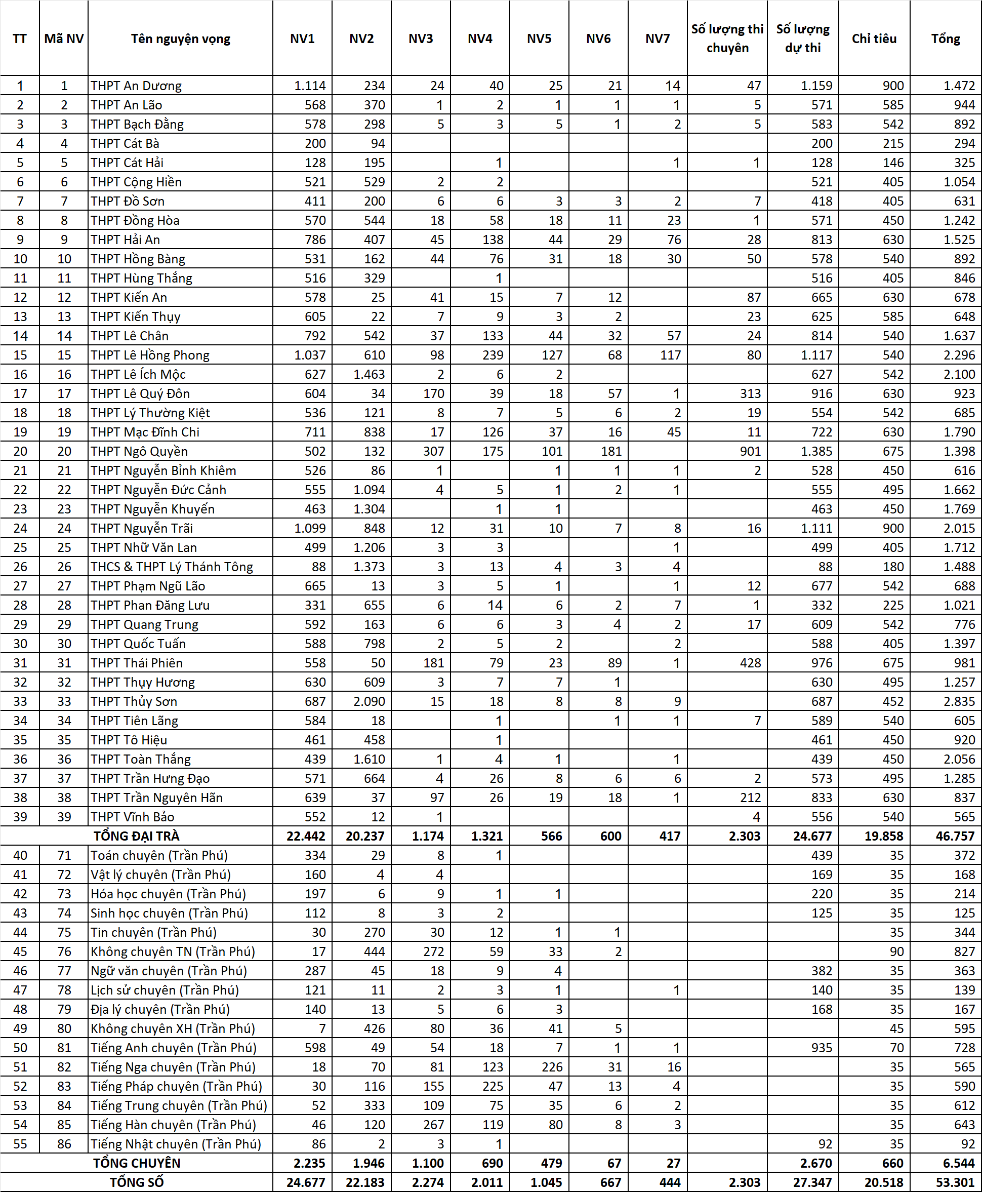 Thống kê của Sở Giáo dục và Đào tạo về số lượng thí sinh đăng ký dự thi tuyển sinh vào lớp 10 THPT năm học 2023-2024, tính đến 8h20 ngày 10/5/2023.