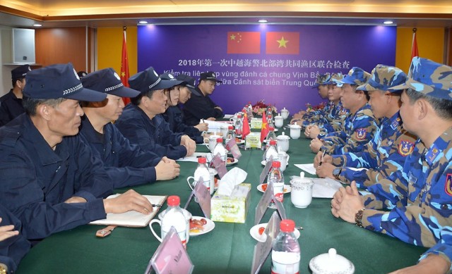 Sáng 24-4, Đại tá Trần Văn Thơ, Phó tư lệnh – Tham mưu trưởng Bộ Tư lệnh (BTL) Vùng Cảnh sát biển (CSB) 1 dẫn đầu đoàn CSB Việt Nam sang tàu chỉ huy CSB Trung Quốc 3305 hội đàm, thống nhất phương án kiểm tra liên hiệp nghề cá Vùng đánh cá chung vịnh Bắc Bộ Việt Nam – Trung Quốc lần thứ nhất 2018. Đồng chí Lưu Thiêm Vinh, Phó phân cục trưởng Phân cục Nam Hải tiếp đoàn công tác.