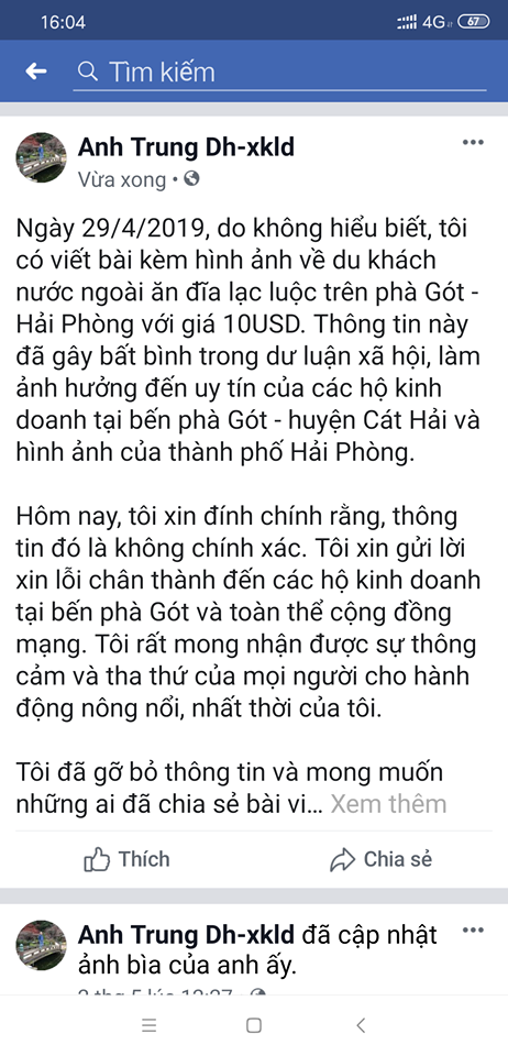Sau khi được Thanh tra Sở phân tích, giải thích pháp luật, bản thân Đ.H.T đã nhận thức rõ và thừa nhận về hành vi đăng tải bài viết về “du khách nước ngoài ăn đĩa lạc luộc trên phà Gót – Hải Phòng với giá 10 USD” là không có căn cứ, không chính xác, vi phạm quy định của pháp luật, gây bức xúc trong dư luận, ảnh hưởng đến nhiều người và giải trình “do nóng vội, bồng bột nên đã đăng thông tin này lên trang cá nhân”.