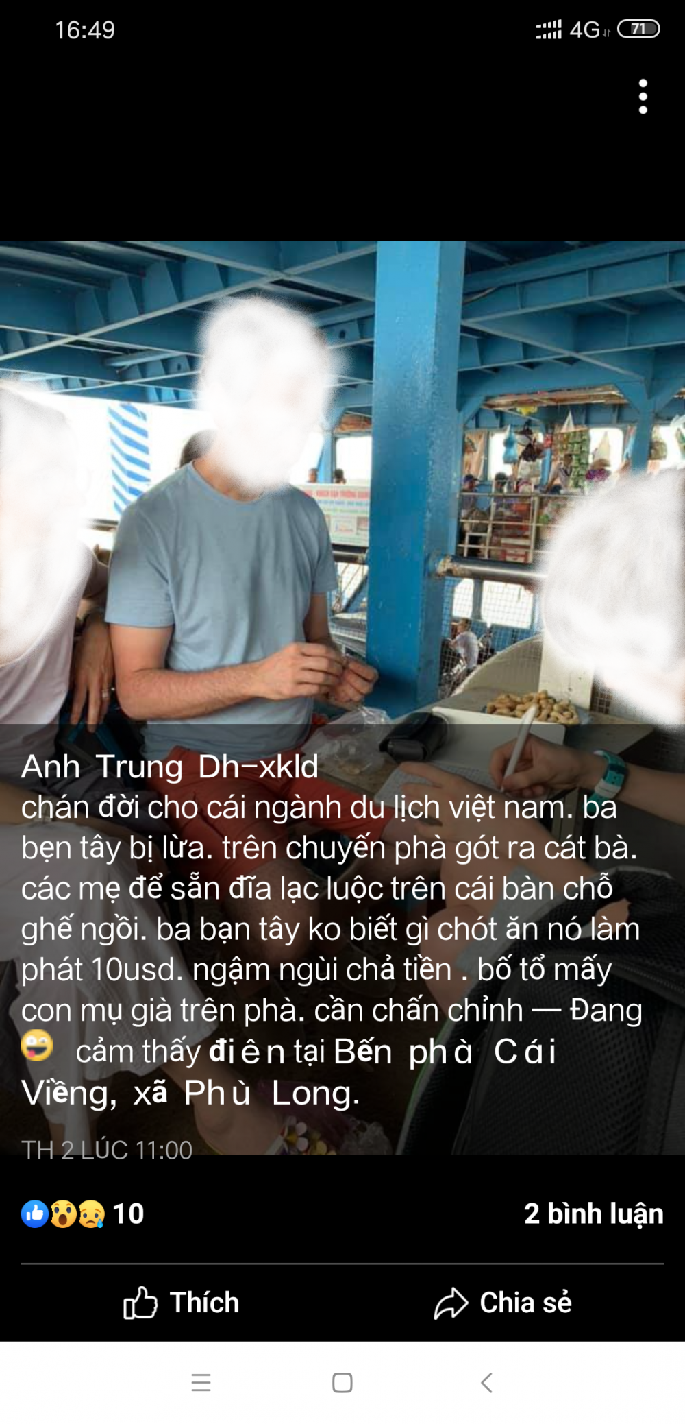 Được biết, ngày 29-4 trên mạng xã hội facebook (tài khoản Anh Trung Dh-xkld (Cậu Buồn), fb.com/vocam09) có đăng tải nội dung về người khách ngước ngoài phải trả 10 USD cho đĩa lạc luộc trên phà Gót. Thông tin này đã được lan truyền nhanh chóng trên mạng xã hội, gây bức xúc trong cộng đồng về việc cố tình “chặt chém” khách quốc tế, ảnh hưởng đến hình ảnh du lịch của thành phố Hải Phòng. Nhưng đến ngày 30-4, tài khoản facebook nêu trên đã tự gỡ bỏ thông tin, hình ảnh, bài viết này.