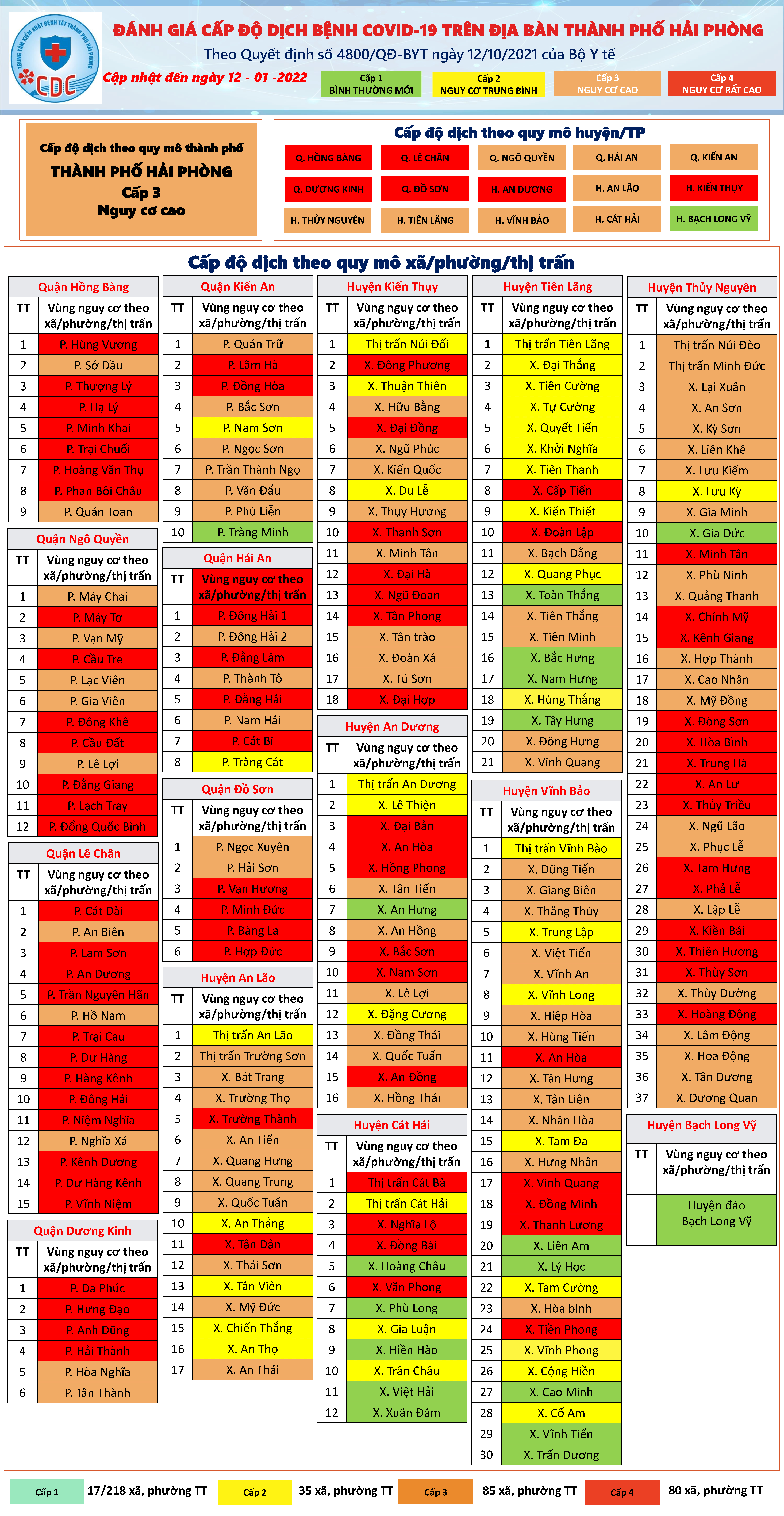 Căn cứ theo Quyết định 4800/QĐ-BYT ngày 12/10/2021 của Bộ Y tế về việc ban hành Hướng dẫn tạm thời chuyên môn y tế thực hiện Nghị quyết số 128/NQ-CP ngày 11/10/2021 của Chính phủ ban hành Quy định tạm thời “Thích ứng an toàn, linh hoạt, kiểm soát hiệu quả dịch COVID-19”, Trung tâm Kiểm soát bệnh tật thành phố Hải Phòng thông tin về cấp độ dịch bệnh COVID-19 trên địa bàn thành phố Hải Phòng cập nhật đến ngày 12/01/2022 như sau: