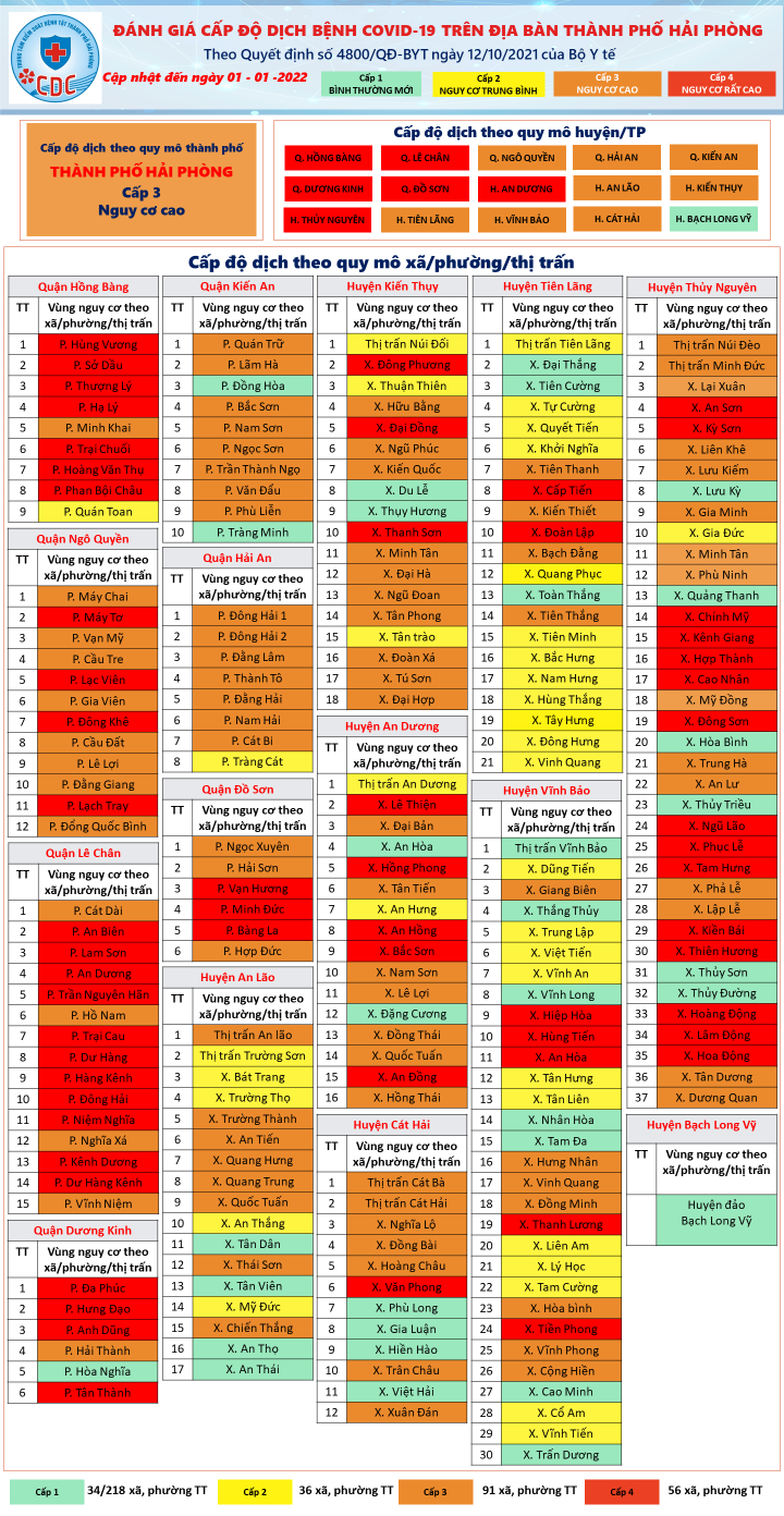 Căn cứ theo Quyết định 4800/QĐ-BYT ngày 12/10/2021 của Bộ Y tế về việc ban hành Hướng dẫn tạm thời chuyên môn y tế thực hiện Nghị quyết số 128/NQ-CP ngày 11/10/2021 của Chính phủ ban hành Quy định tạm thời “Thích ứng an toàn, linh hoạt, kiểm soát hiệu quả dịch COVID-19”, Trung tâm Kiểm soát bệnh tật thành phố Hải Phòng thông tin về cấp độ dịch bệnh COVID-19 trên địa bàn thành phố Hải Phòng ngày 01/01/2022 như sau:
