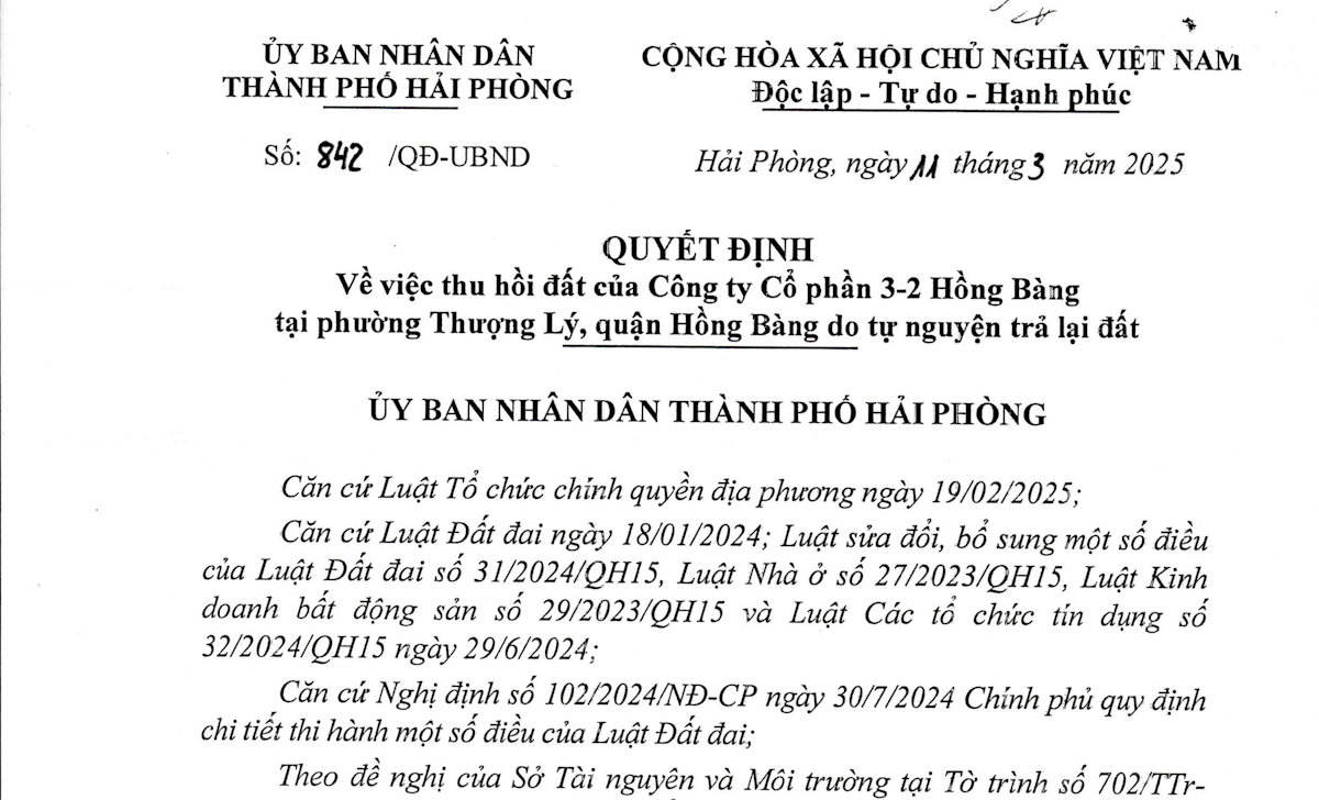 Theo Quyết định, thu hồi 532,2m² (Năm trăm ba mươi hai phẩy hai mét vuông) đất tại phường Thượng Lý, quận Hồng Bàng do Công ty Cổ phần 3-2 Hồng Bàng tự nguyện trả lại đất theo quy định tại điểm c khoản 2 Điều 82 Luật Đất đai năm 2024, giao Trung tâm Phát triển quỹ đất thành phố quản lý. Vị trí, chỉ giới khu đất xác định theo Trích lục địa chính số 2523/2024-TL, tỷ lệ 1/500 do Trung tâm Kỹ thuật-Dữ liệu, Thông tin Tài nguyên và Môi trường thuộc Sở Tài nguyên và Môi trường lập ngày 06/12/2024.