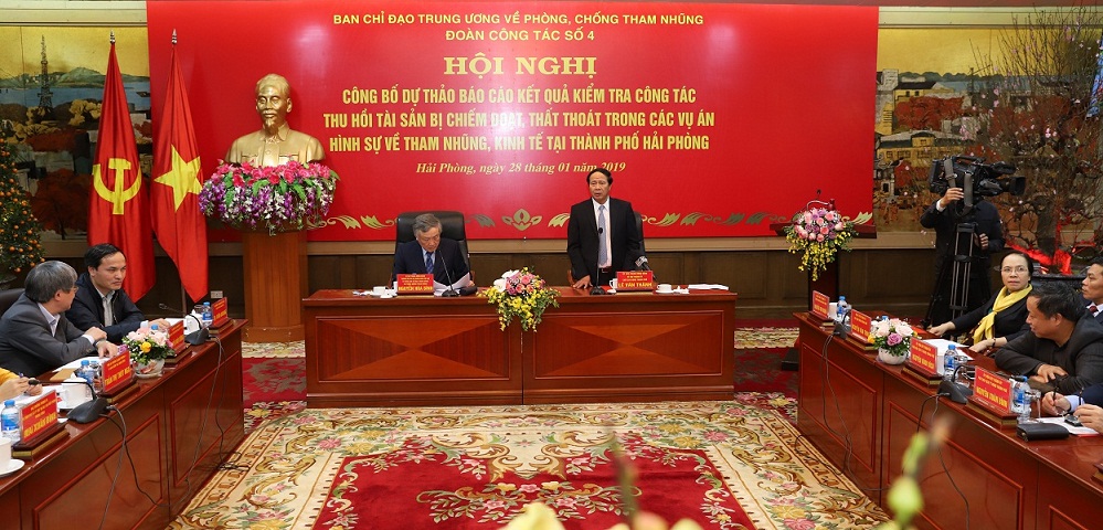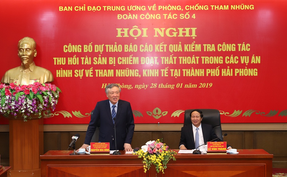 Sáng 28-1, Đoàn công tác số 4 của Ban Chỉ đạo Trung ương về phòng chống tham nhũng (PCTN) do đồng chí Nguyễn Hòa Bình – Bí thư Trung ương Đảng, Chánh án Tòa án nhân dân tối cao, Ủy viên Ban chỉ đạo Trung ương về PCTN, làm Trưởng đoàn đã làm việc với Ban Thường vụ Thành ủy về công bố dự thảo Báo cáo kết quả kiểm tra công tác thu hồi tài sản bị chiếm đoạt, thất thoát trong các vụ án hình sự về tham nhũng, kinh tế tại Hải Phòng.
