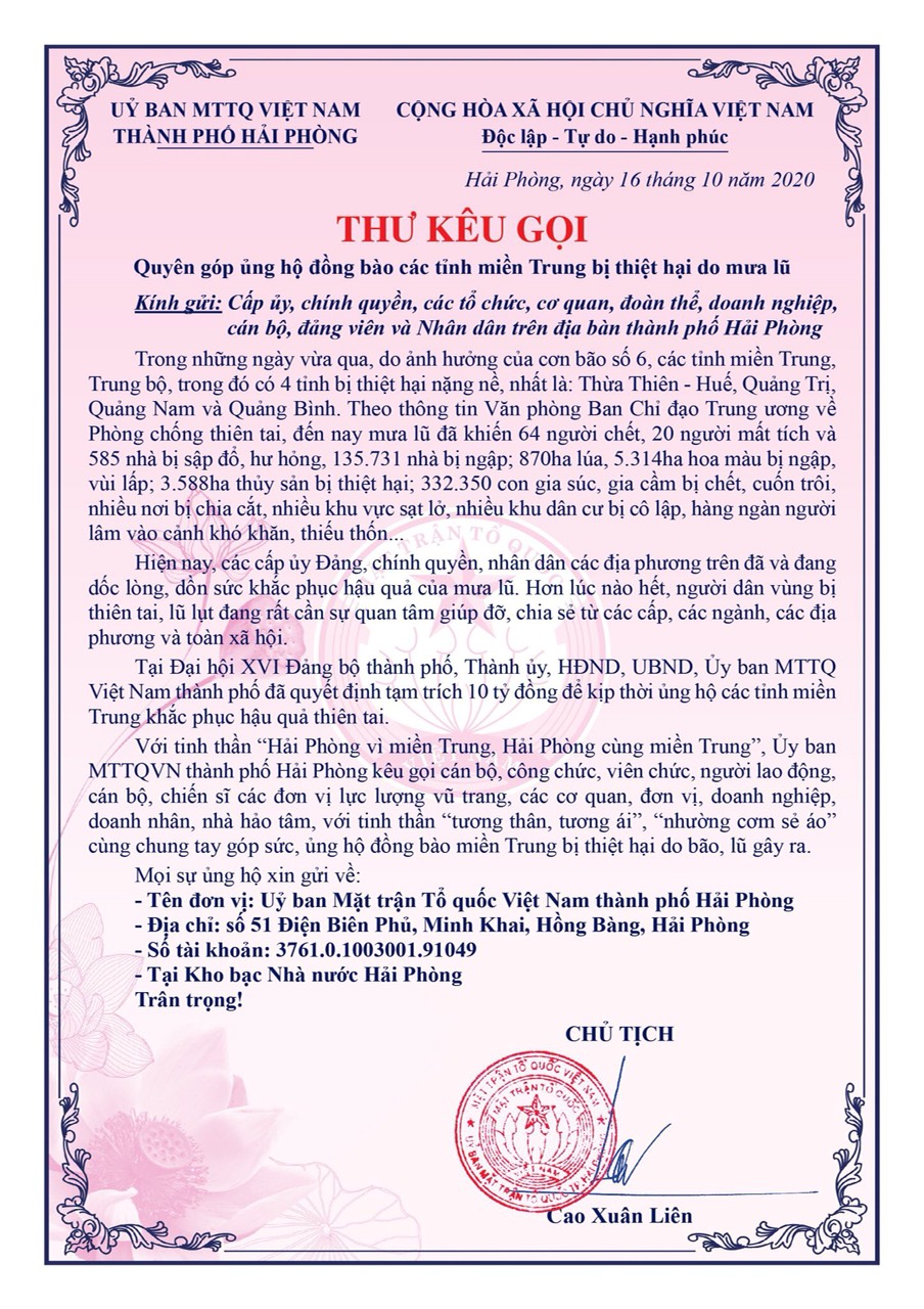 Ủy ban MTTQ Việt Nam thành phố vừa có Thư kêu gọi quyên góp ủng hộ đồng bào các tỉnh miền Trung bị thiệt hại do mưa lũ, gửi các cấp ủy, chính quyền, các tổ chức, cơ quan, đoàn thể, doanh nghiệp, cán bộ, đảng viên và Nhân dân trên địa bàn thành phố Hải Phòng.