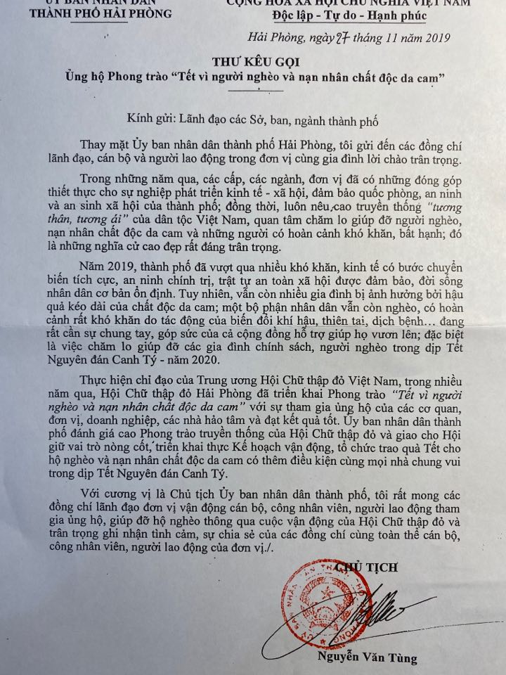 Hưởng ứng lời kêu gọi của Trung ương Hội Chữ thập đỏ Việt Nam về Phong trào “Tết vì người nghèo và nạn nhân chất độc da cam”, ngày 27/11/2019, Đồng chí Nguyễn Văn Tùng, Phó Bí thư Thành ủy, Chủ tịch Ủy ban nhân dân thành phố có Thư kêu gọi ủng hộ Phong trào “Tết vì người nghèo và nạn nhân chất độc da cam”.