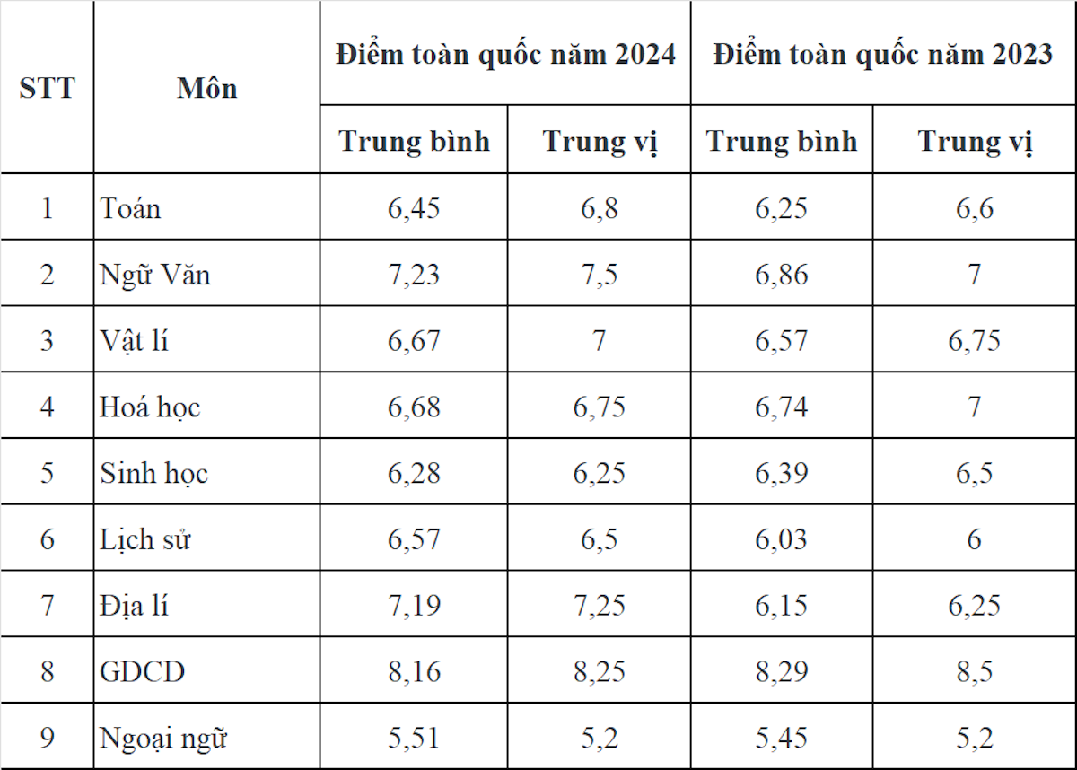 Sau khi công bố điểm thi, Bộ GD&ĐT đánh giá, nhìn chung, phổ điểm của các môn thi tốt nghiệp THPT năm 2024 vẫn giữ được sự ổn định và tương đồng với phổ điểm năm 2023 và các năm trước. Điểm trung bình và trung vị của các môn thi trên toàn quốc được giữ ổn định và tương đồng so với năm 2023, thể hiện ở bảng thống kê sau: