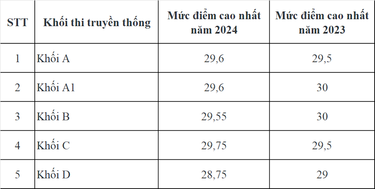 Theo thống kê của Bộ GD&ĐT, mức điểm cao nhất năm 2024 là thí sinh ở khối C đạt 29,75 điểm.