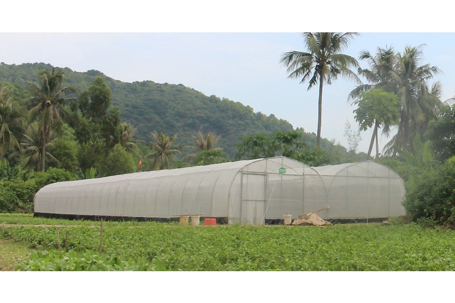 Mô hình nhà lưới trồng rau an toàn nằm trong thung lũng bằng phẳng gần bờ biển.