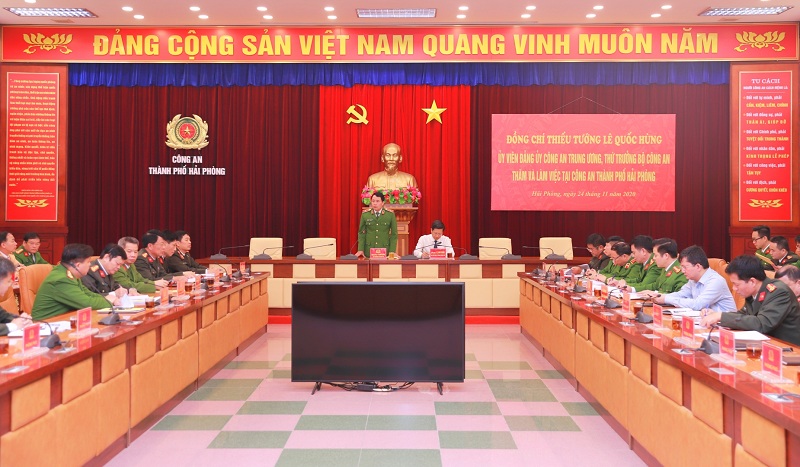 Sáng 24-11, Thiếu tướng Lê Quốc Hùng, Ủy viên Đảng ủy CATW, Thứ trưởng Bộ Công an dẫn đầu đoàn công tác của Bộ Công an đến thăm, làm việc với cán bộ chủ chốt của CATP Hải Phòng về tình hình, công tác bảo đảm ANTT năm 2020, nhiệm vụ bảo vệ ANTT từ nay đến tết nguyên đán Tân Sửu-2021; công tác Cảnh sát cơ động, Cảnh sát PCCC, thi hành án hình sự và hỗ trợ tư pháp.