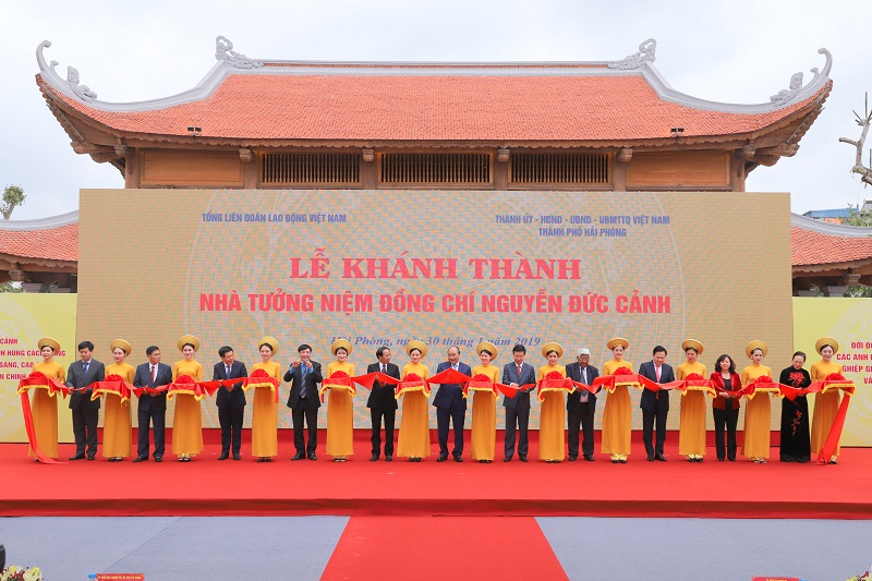 Thủ tướng Chính phủ Nguyễn Xuân Phúc, Bí thư Thành ủy Lê Văn Thành, Chủ tịch Tổng LĐLĐ Việt Nam Bùi Văn Cường và các đồng chí lãnh đạo thực hiện nghi lễ cắt băng khánh thành Nhà tưởng niệm đồng chí Nguyễn Đức Cảnh