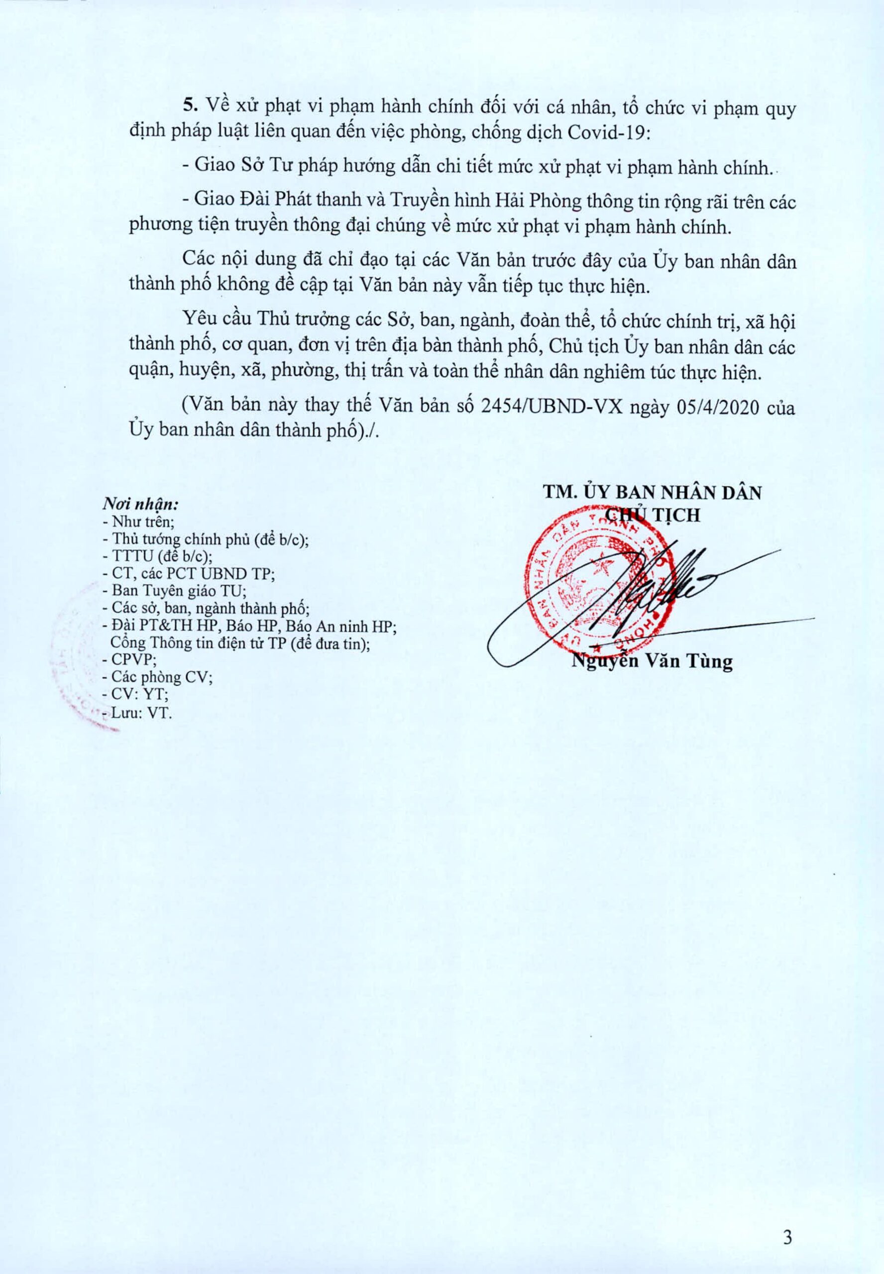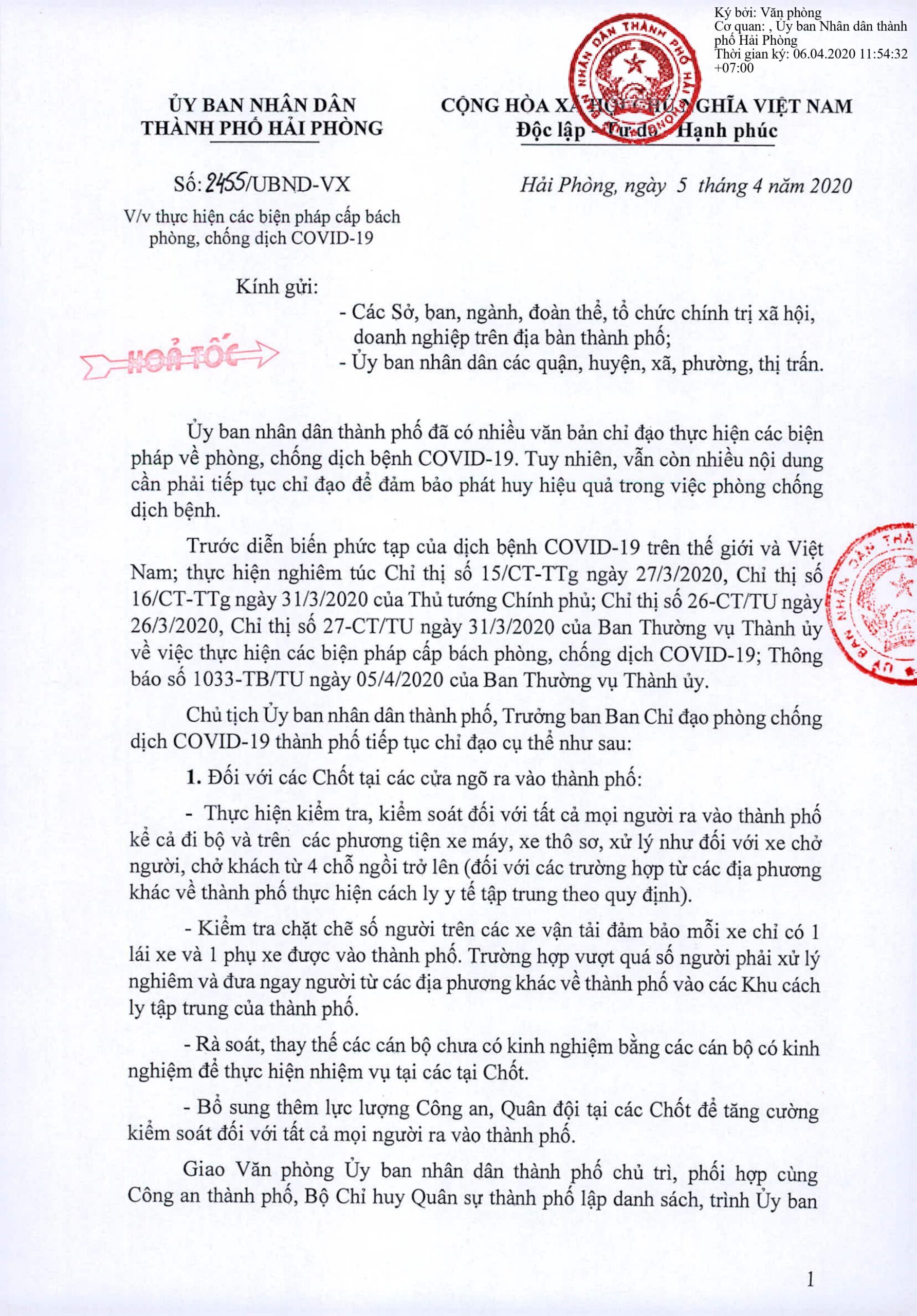 Thực hiện các biện pháp cấp bách phòng, chống dịch COVID-19, ngày 05/4/2020 Ủy ban nhân dân thành phố đã có văn bản số 2455/UBND-VX gửi các Sở, ban, ngành, tổ chức chính trị xã hội, doanh nghiệp trên địa bàn thành phố; Ủy ban nhân dân các quận, huyện, xã, phường, thị trấn.