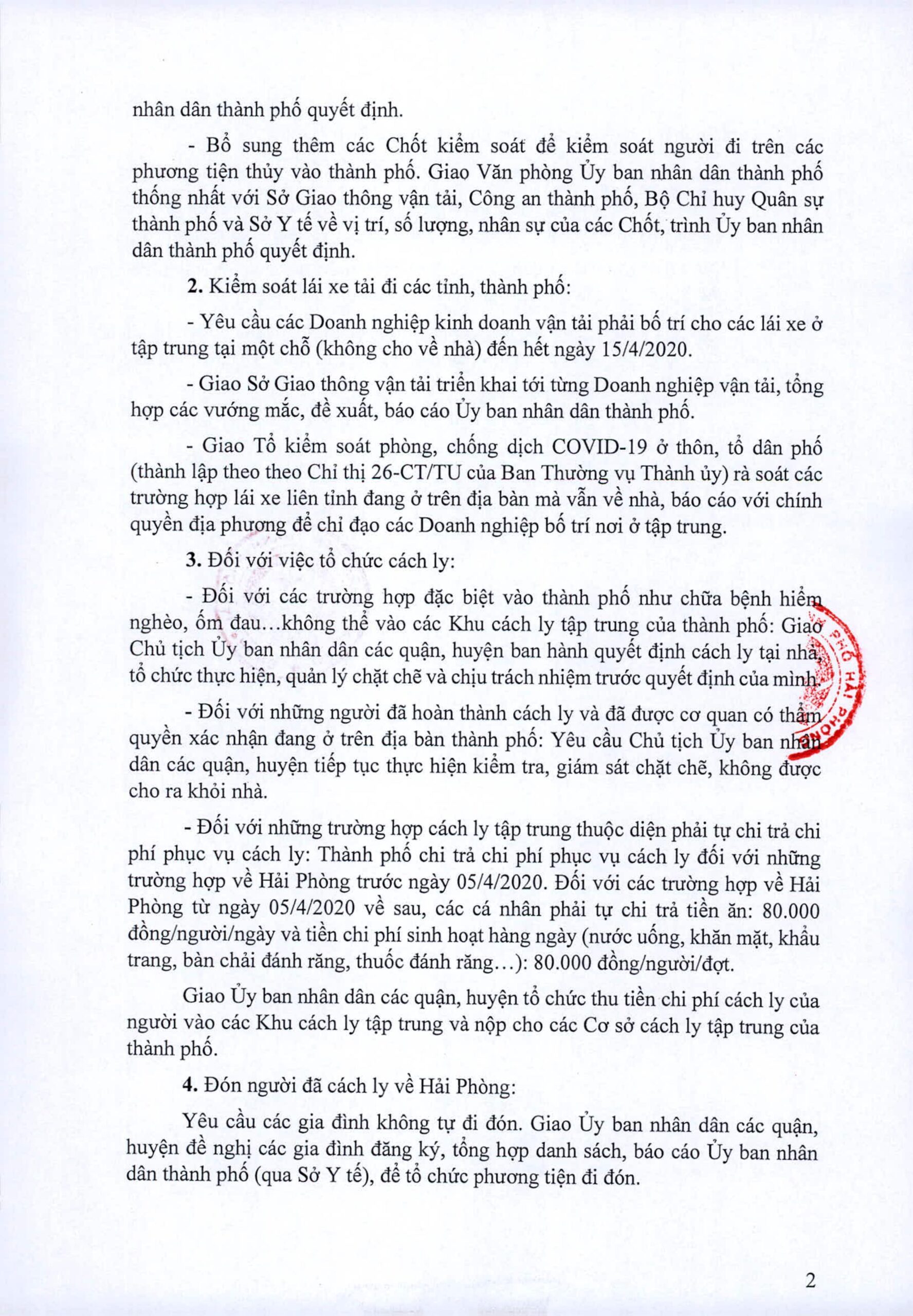 Kiểm tra chặt chẽ số người trên các xe vận tải đảm bảo mỗi xe chỉ có 1 lái xe và 1 phụ xe được vào thành phố. Trường hợp vượt quá số người phải xử lý nghiêm và đưa ngay người từ các địa phương khác về thành phố vào các Khu cách ly tập trung của thành phố.