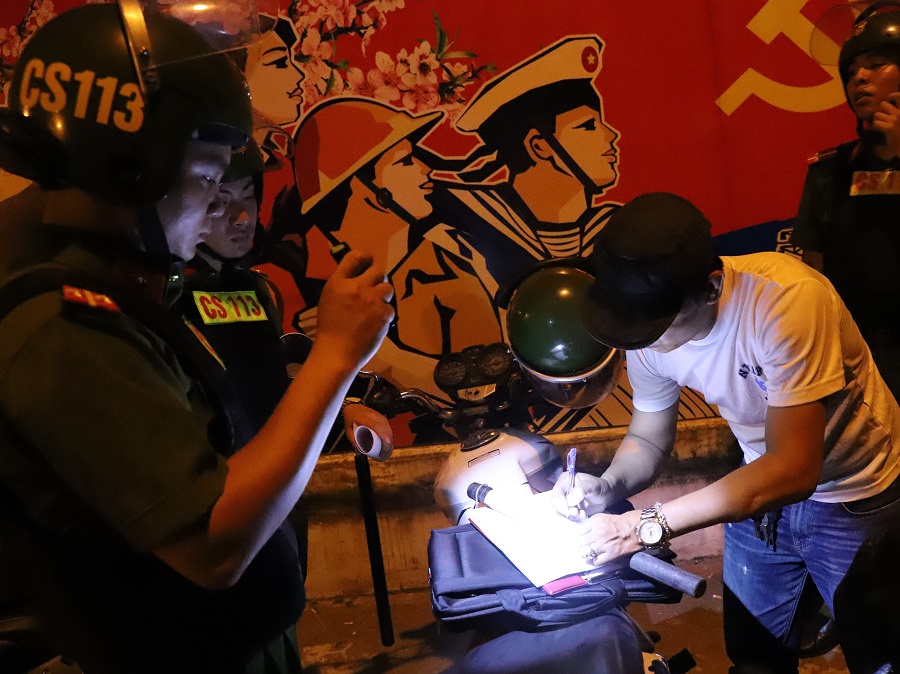 Tổ công tác kiểm tra hành chính các phương tiện tham gia giao thông tại khu vực Ngã tư Hồ Sen (ảnh Phan Tuấn)