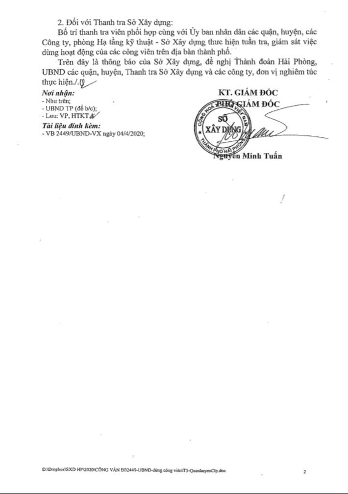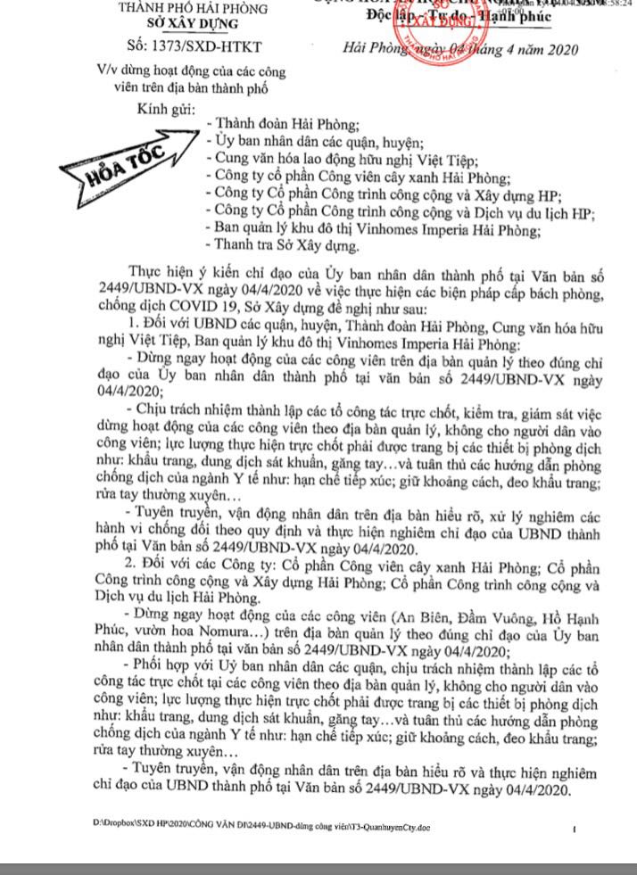 Đối với các Công ty Cổ phần Công viên cây xanh Hải Phòng, Cổ phần Công trình công cộng và Xây dựng Hải Phòng, Cổ phần Công trình công cộng và Dịch vụ du lịch Hải Phòng dừng ngay hoạt động của các công viên An Biên, Đầm Vuông, Hồ Hạnh Phúc, vườn hoa Nomura… Phối hợp với Ủy ban nhân dân các quận, chịu trách nhiệm thành lập các tổ công tác trực chốt theo địa bàn quản lý.