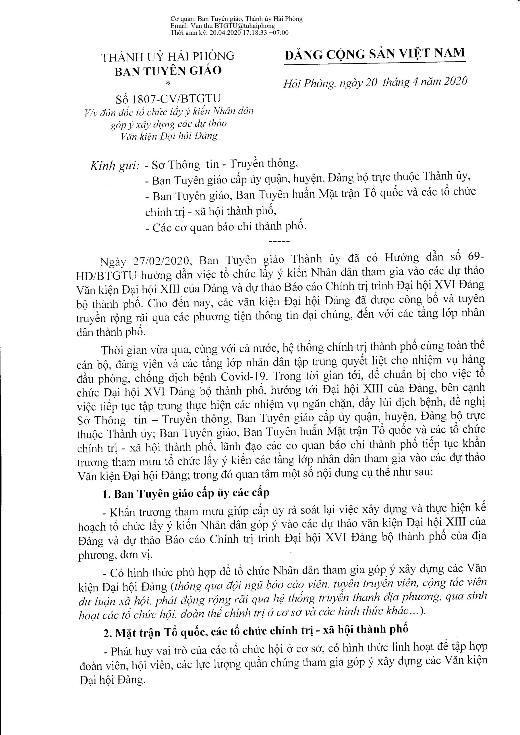 Ban Tuyên giáo Thành ủy Hải Phòng vừa có công văn số 1807-CV/BTGTU ngày 20/4/2020 về việc đôn đốc tổ chức lấy ý kiến Nhân dân góp ý xây dựng các dự thảo Văn kiện Đại hội Đảng, chuẩn bị cho việc tổ chức Đại hội XVI Đảng bộ thành phố, hướng tới Đại hội XIII của Đảng.