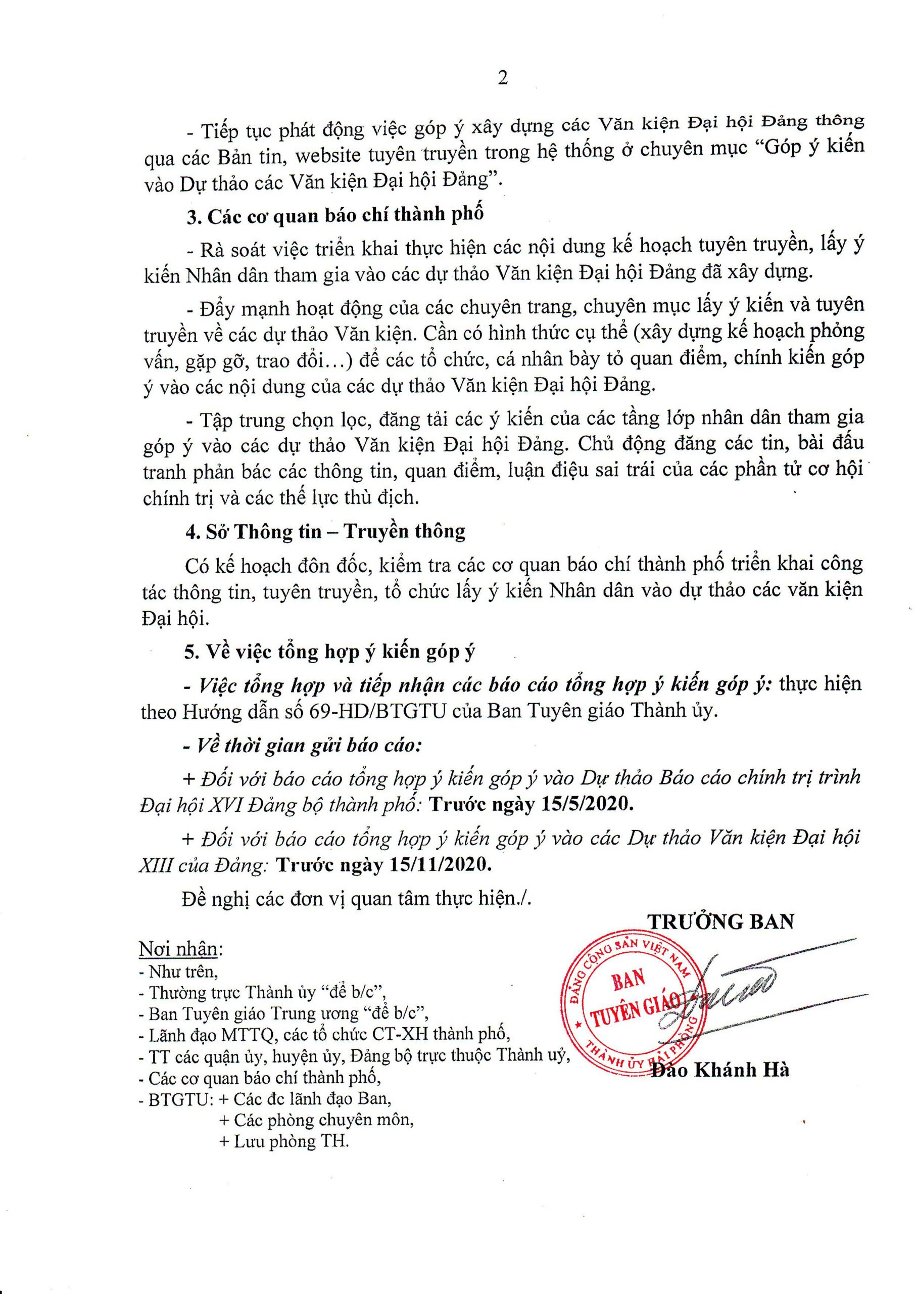 Theo đó, Ban Tuyên giáo cấp ủy các cấp khẩn trương tham mưu giúp cấp ủy rà soát lại việc xây dựng và thực hiện kế hoạch tổ chức lấy ý kiến Nhân dân góp ý vào các dự thảo văn kiện Đại hội XIII của Đảng và dự thảo Báo cáo Chính trị trình Đại hội XVI Đảng bộ thành phố của địa phương, đơn vị; có hình thức phù hợp để tổ chức Nhân dân tham gia góp ý xây dựng các Văn kiện Đại hội Đảng.
