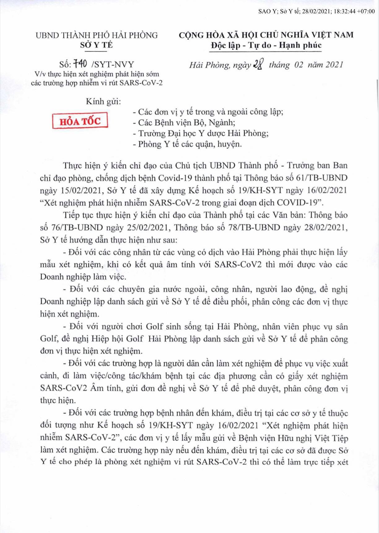Sở Y tế vừa có Văn bản số 740/SYT-NVY ngày 28/02/2021 về thực hiện xét nghiệm phát hiện sớm các trường hợp nhiễm virus SARS-CoV-2. Theo đó: