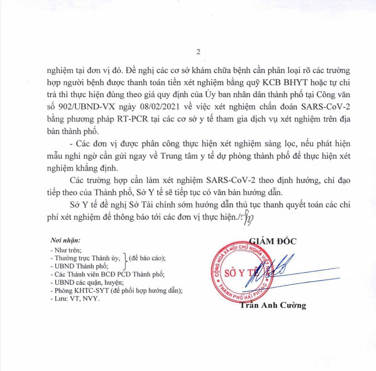 – Đối với các trường hợp bệnh nhân đến khám, điều trị tại các cơ sở y tế thuộc đối tượng như Kế hoạch số 19/KH-SYT ngày 16/02/2021 “Xét nghiệm phát hiện nhiễm SARS-CoV-2”, các đơn vị y tế lấy mẫu gửi về Bệnh viện Hữu Nghị Việt Tiệp làm xét nghiệm. Các trường hợp này nếu đến khám, điều trị tại các cơ sở đã được Sở Y tế cho phép là phòng xét nghiệm vi rút SARS-CoV-2 thì có thể làm trực tiếp xét nghiệm tại đơn vị đó. Đề nghị các cơ sở khám chữa bệnh cần phân loại rõ các trường hợp người bệnh được thanh toán tiền xét nghiệm bằng quỹ KCB BHYT hoặc tự chi trả thì thực hiện đúng theo giá quy định của Ủy ban nhân dân thành phố tại Công văn số 902/UBND-VX ngày 08/02/2021 về việc xét nghiệm chẩn đoán SARS-CoV-2 bằng phương pháp RT-PCR tại các cơ sở y tế tham gia dịch vụ xét nghiệm trên địa bàn thành phố.
