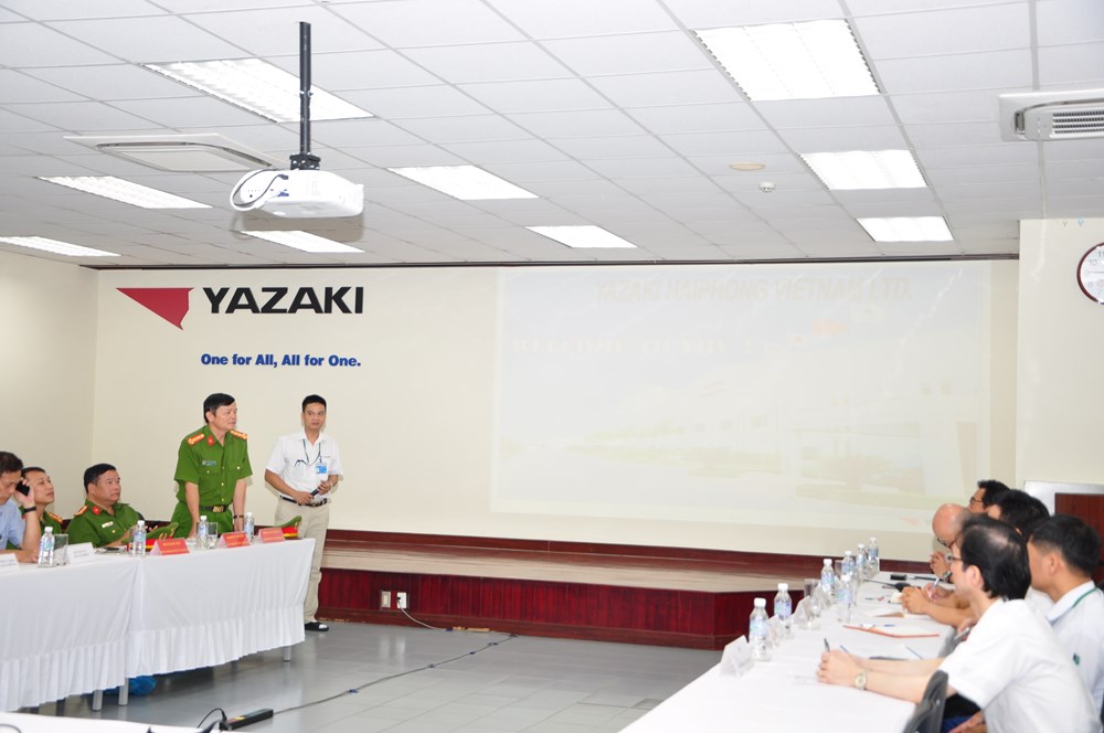Tham gia buổi thực tập, Phòng Cảnh sát PCCC và cứu nạn, cứu hộ đã phối hợp với đội PCCC Khu công nghiệp Nomura, Công ty TNHH Yazaki Hải Phòng Việt Nam xử lý tình huống: do chập điện nên khoảng 10h ngày 25-9, xảy ra cháy tại phòng họp tầng 2, khu nhà văn phòng. Hệ thống báo cháy tự động đang bảo dưỡng nên không hoạt động.