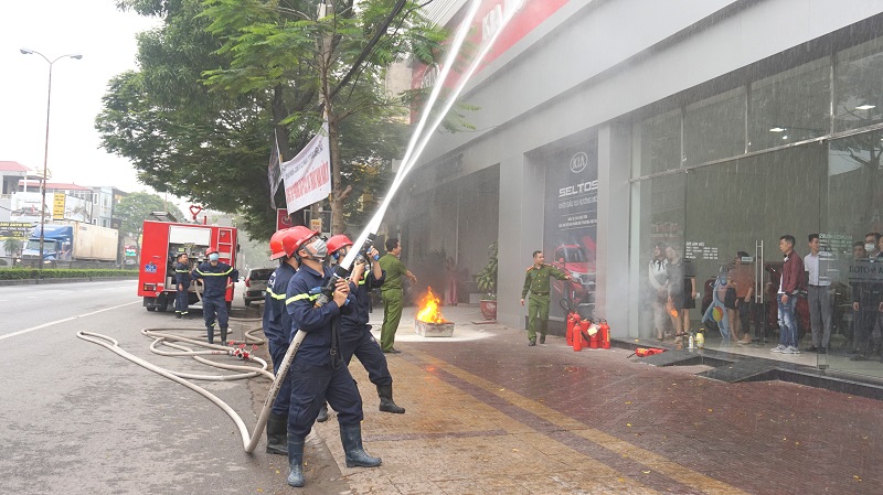 Sáng 10-4, Đội Cảnh sát PCCC&CNCH Công an quận Lê Chân tổ chức thực tập phương án chữa cháy và cứu nạn, cứu hộ tại Công ty cổ phần ô tô Trường Hải.