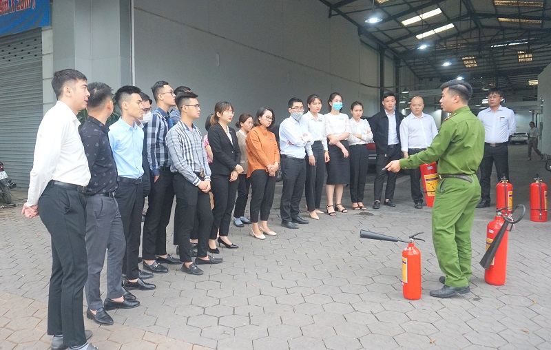 Trước khi thực tập phương án chữa cháy, cán bộ Đội Cảnh sát PCCC&CNCH Công an quận Lê Chân hướng dẫn công nhân Công ty cổ phần ô tô Trường Hải các thao tác sử dụng phương tiện chữa cháy tại chỗ, quy trình xử lý khi có sự cố tại nạn xảy ra.