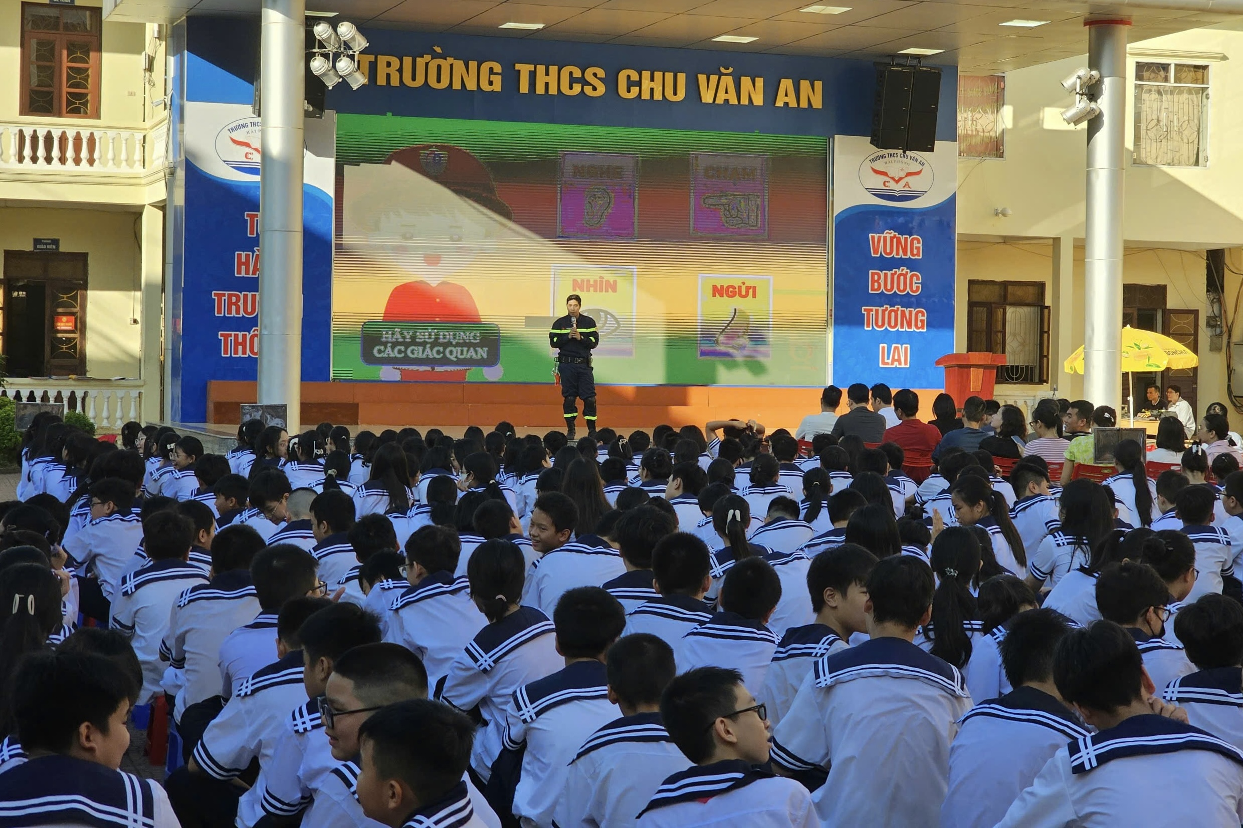 Cán bộ, giáo viên, nhân viên, học sinh Trường THCS Chu Văn An đã được cán bộ Đội Cảnh sát PCCC&CNCH Công an quận Ngô Quyền thông tin về tình hình cháy nổ, nguyên nhân xảy ra các vụ cháy trong thời gian gần đây. Đồng thời hướng dẫn một số biện pháp đảm bảo an toàn PCCC tại gia đình và trường học; cách xử lý sự cố cháy, nổ; kỹ năng thoát nạn trong khi có cháy, nổ, tai nạn, sự cố xảy ra; tìm hiểu cách sử dụng một số phương tiện chữa cháy tại chỗ để dập tắt các đám cháy.