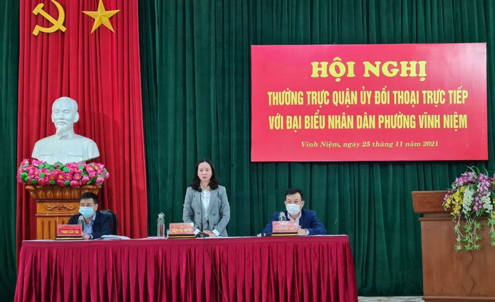 Sáng 25/11, Thường trực Quận ủy Lê Chân tổ chức Hội nghị đối thoại với đại biểu Nhân dân phường Vĩnh Niệm. Đồng chí Trần Thu Hương, Ủy viên Thành ủy, Bí thư Quận ủy chủ trì Hội nghị.
