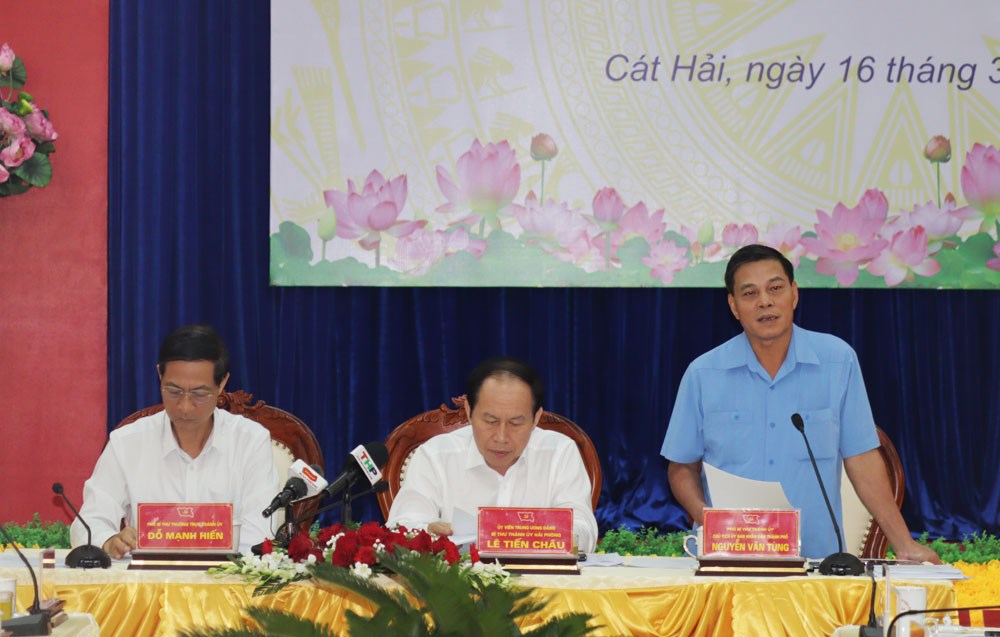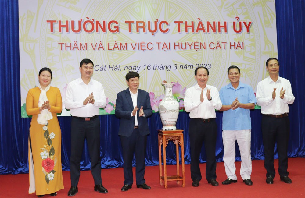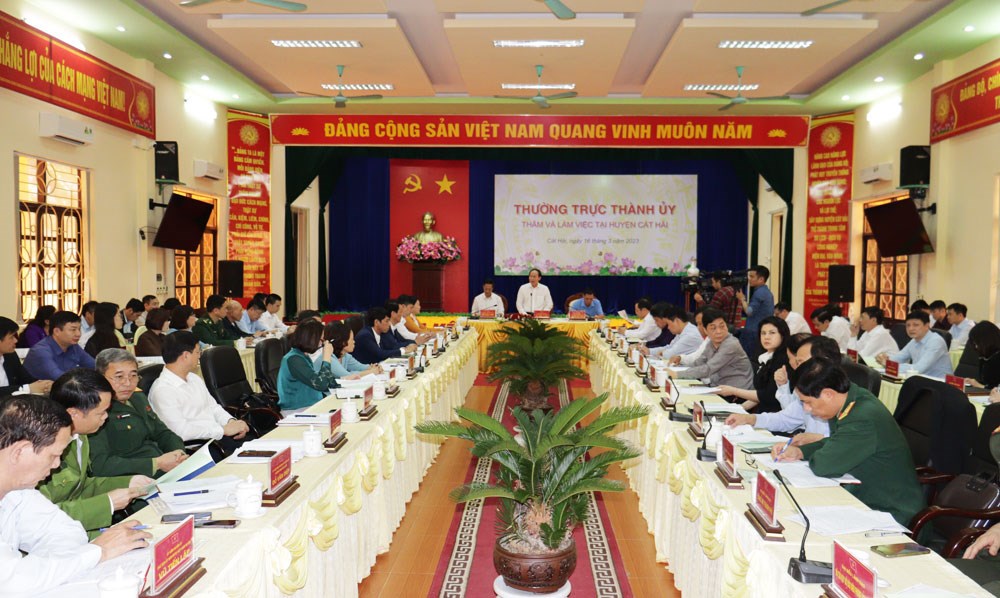 Đồng chí Bí thư Thành ủy nhấn mạnh, huyện Cát Hải rất nhiều tiềm năng, lợi thế, có nhiều điều kiện thuận lợi để phát triển, định hướng phát triển huyện cũng đã rõ, do đó Đảng bộ, chính quyền huyện cần phát huy tốt các tiềm năng lợi thế đó, huy động mọi nguồn lực để xây dựng và phát triển huyện nhanh, bứt phá, quyết tâm đưa huyện trở thành trung tâm du lịch, dịch vụ trọng điểm, đặc biệt là phát triển kinh tế biển, tập trung cho công nghiệp, du lịch, cảng biển, phải là pháo đài vững chắc về quốc phòng, an ninh.