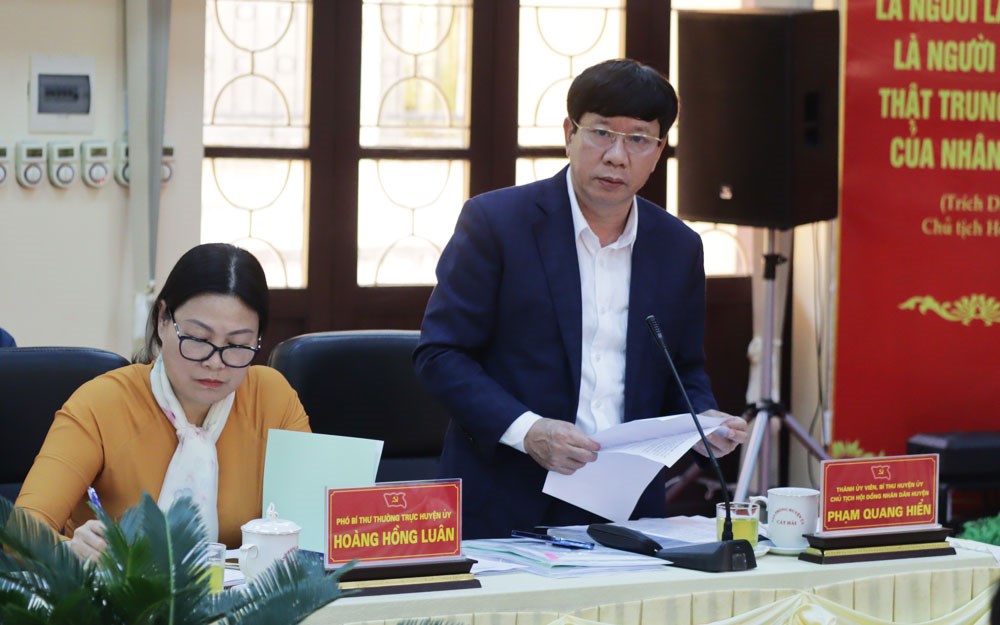 Đồng chí Bí thư Thành ủy đề nghị Đảng bộ huyện phải tiếp tục xây dựng một tập thể đoàn kết, thực hiên nghiêm nguyên tắc tập trung dân chủ để phát huy trí tuệ tập thể, tìm ra các giải pháp hiệu quả thực hiện thắng lợi Nghị quyết Đại hội XII của Đảng bộ huyện. Đồng chí lưu ý huyện cần làm tốt công tác xây dựng Đảng, hệ thống chính trị; quan tâm công tác đào tạo đội ngũ cán bộ, nhất là cán bộ trẻ, phát huy tinh thần năng động sáng tạo, tiên phong của cán bộ, đảng viên để hoàn thành các chương trình, kế hoạch đề ra; phát huy tốt vai trò của Mặt trận Tổ quốc và các đoàn thể, quan tâm lãnh đạo, chỉ đạo thực hiện tốt công tác tuyên truyền, vận động người dân, nhất là người dân ở khu vực có dự án, đảm bảo đáp ứng được yêu cầu nhiệm vụ chính trị của địa phương. Về phát triển kinh tế-xã hội, huyện cần tăng cường kỷ cương thu, chi ngân sách nhà nước, thực hiện đồng bộ, quyết liệt, hiệu quả các nhiệm vụ, giải pháp chống thất thu ngân sách; đẩy nhanh tiến độ thi công các công trình dự án trên địa bàn; tập trung hoàn thành giải phóng mặt bằng phục vụ các dự án lớn trên địa bàn; tiếp tục quan tâm đến công tác cải cách hành chính, giải quyết khó khăn cho người dân, doanh nghiệp… Cùng với phát triển kinh tế, quan tâm đến văn hóa, xã hội, y tế, an sinh xã hội, nâng cao đời sống vật chất, tinh thần cho người dân; tích cực phối hợp với các sở, ngành liên quan để tháo gỡ khó khăn, vướng mắc trong quá trình thực hiện nhiệm vụ…