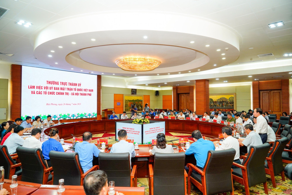 Chiều 26/7, Thường trực Thành ủy làm việc với Ủy ban MTTQ Việt Nam và các tổ chức chính trị-xã hội thành phố. Các đồng chí: Lê Tiến Châu, Ủy viên Trung ương Đảng, Bí thư Thành ủy; Nguyễn Văn Tùng, Phó Bí thư Thành ủy, Chủ tịch UBND thành phố; Đỗ Mạnh Hiến, Phó Bí thư Thường trực Thành ủy đồng chủ trì cuộc làm việc.