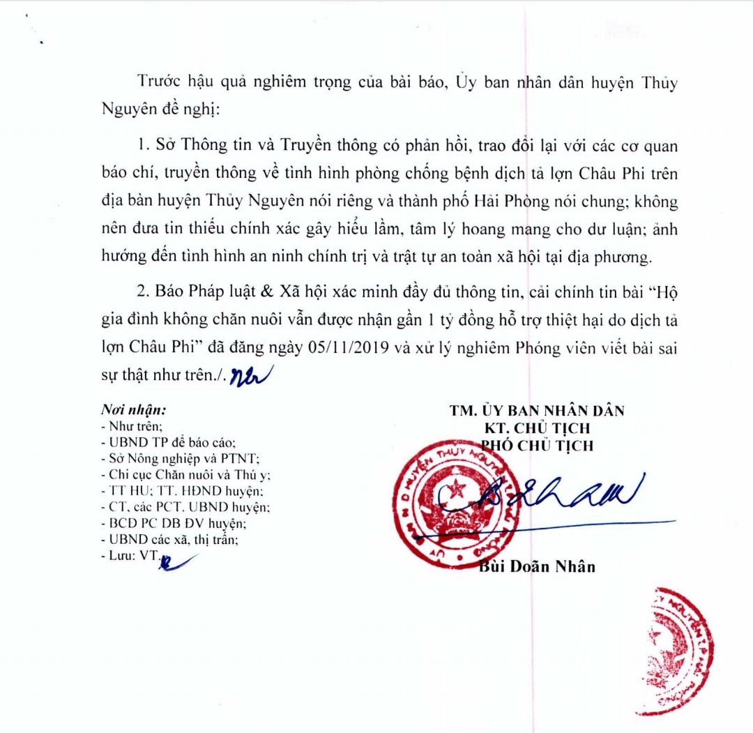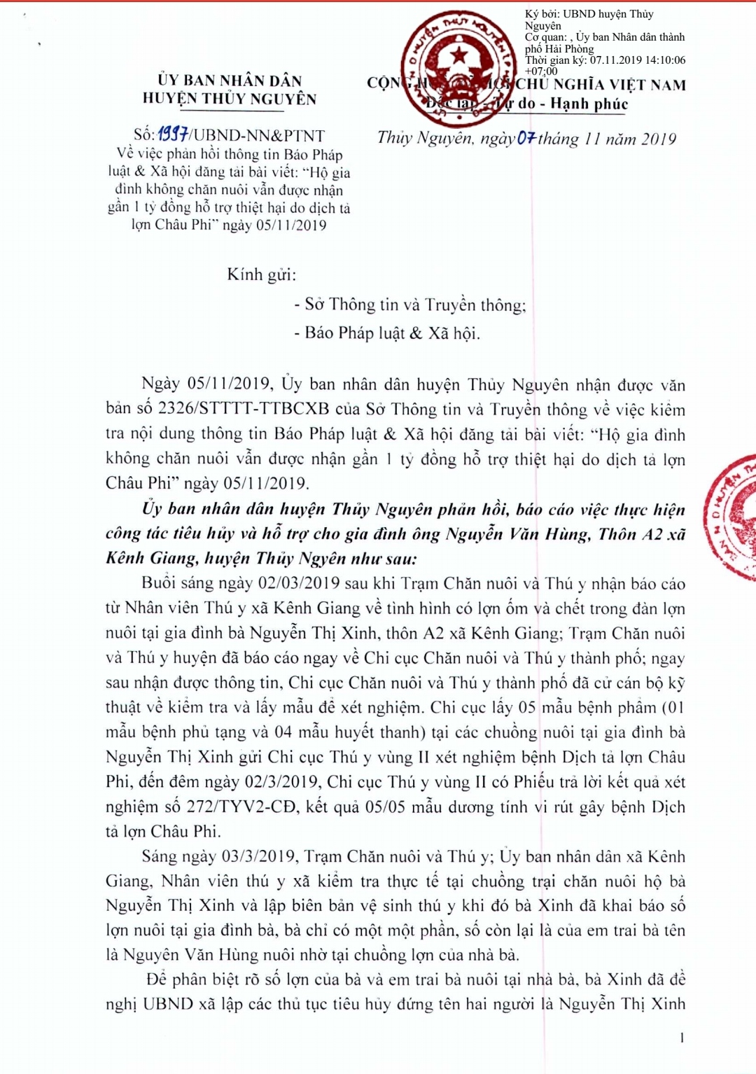 Ngày 7/11/2019, UBND huyện Thủy Nguyên có văn bản số 1997/UBND-NN&PTNT về việc phản hồi thông tin Báo Pháp luật và Xã hội đăng tải bài viết “Hộ gia đình không chăn nuôi vẫn nhận được gần 1 tỷ đồng hỗ trợ thiệt hại do dịch tả lợn Châu Phi” ngày 05/11/2019.