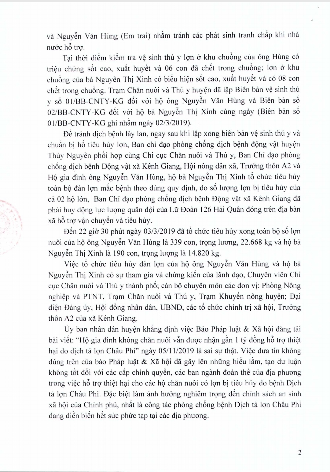 Việc đưa tin không đúng trên của Báo Pháp luật và Xã hội đã gây lên những hiểu lầm, tạo dư luận không tốt đối với các cấp chính quyền, các ban ngành đoàn thể của địa phương trong việc hỗ trợ thiệt hại cho các hộ chăn nuôi có lợn bị tiêu hủy do bệnh Dịch tả lợn Châu Phi.