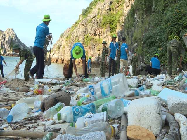 CLB Đô thị xanh Hải Phòng phối hợp với cán bộ, chiến sỹ Đồn Biên phòng Cát Bà dọn dẹp rác thải nhựa tại đảo Long Châu.