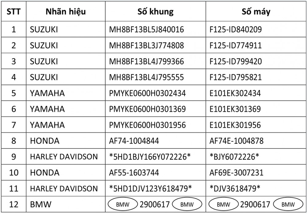 Ngày 4-5-2019, tại khu chung cư Thành Công, xã Đặng Cương, huyện An Dương, TP Hải Phòng, Công an huyện An Dương phát hiện và tạm giữ 12 xe mô tô (chưa xác định chủ sở hữu hợp pháp) gồm: