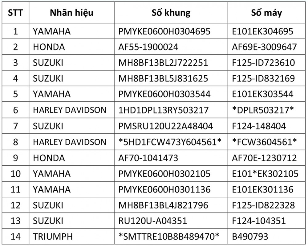 Ngày 4-5-2019, tại khu chung cư Thành Công, xã Đặng Cương, huyện An Dương, TP Hải Phòng, Công an huyện An Dương phát hiện và tạm giữ 12 xe mô tô (chưa xác định chủ sở hữu hợp pháp) gồm: