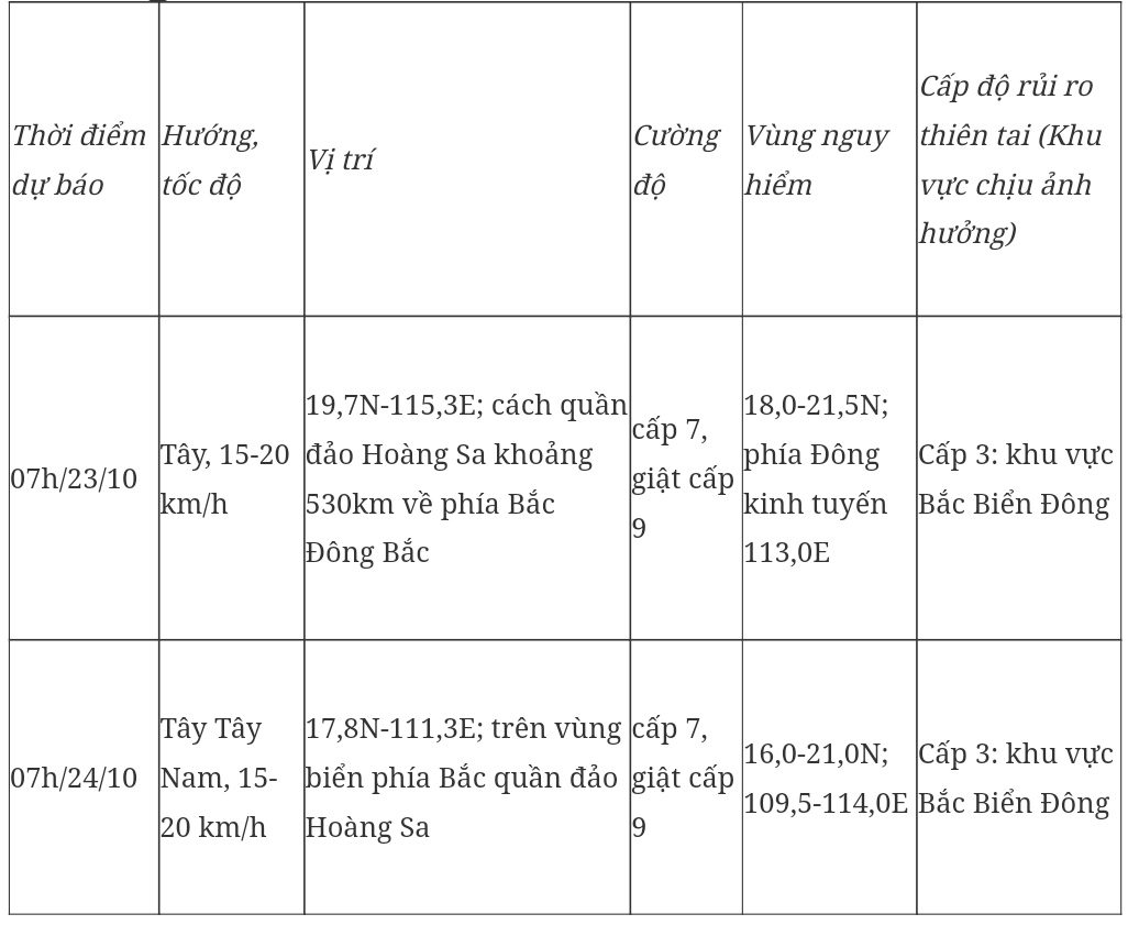 Trung tâm Dự báo Khí tượng Thủy văn Quốc gia cho biết, hồi 07 giờ ngày 22/10, vị trí tâm áp thấp nhiệt đới ở vào khoảng 20,2 độ Vĩ Bắc; 120,2 độ Kinh Đông, cách đảo Lu-Dông (Philippines) khoảng 180km về phía Bắc Tây Bắc.