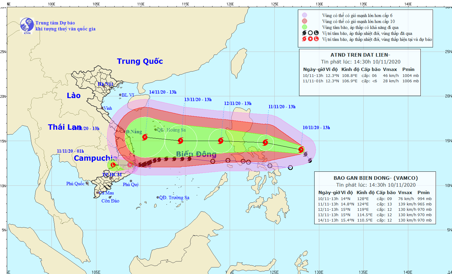 Hồi 13 giờ ngày 10/11, vị trí tâm bão ở khoảng 14,0 độ Vĩ Bắc; 128,0 độ Kinh Đông, cách phía Nam đảo Lu-dông (Phi-líp-pin) khoảng 700km về phía Đông Đông Nam. Sức gió mạnh nhất vùng gần tâm bão mạnh cấp 9 (75-90km/giờ), giật cấp 12.