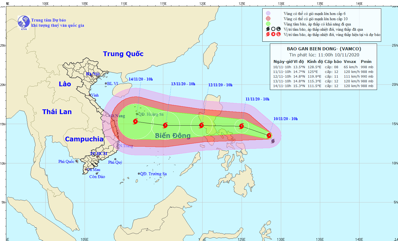 Hồi 10 giờ ngày 10/11, vị trí tâm bão ở khoảng 13,5 độ Vĩ Bắc; 128,5 độ Kinh Đông, cách phía Nam đảo Lu-dông (Phi-líp-pin) khoảng 770km về phía Đông Đông Nam. Sức gió mạnh nhất vùng gần tâm bão mạnh cấp 8 (60-75km/giờ), giật cấp 10.