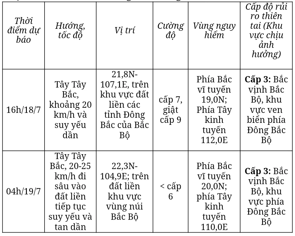 Từ 18/7 đến ngày 19/7, ở khu vực Đông Bắc, Việt Bắc có mưa to đến rất to với lượng mưa phổ biến 200-300mm, cục bộ có nơi trên 350mm; khu vực Tây Bắc, vùng đồng bằng Bắc Bộ có mưa to với tổng lượng mưa từ 100-200mm, Thanh Hóa và Nghệ An có mưa vừa, mưa to, có nơi mưa rất to với lượng mưa phổ biến 70-120mm. Đề phòng mưa với cường suất lớn gây ngập úng đô thị. Cảnh báo nguy cơ cao lũ quét, sạt lở đất tại các tỉnh Quảng Ninh, Lạng Sơn, Cao Bằng, Hà Giang, Lào Cai, Yên Bái.