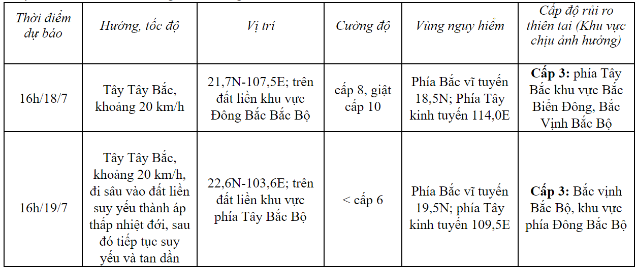 Từ đêm 17/7 đến ngày 19/7, ở khu vực Đông Bắc, Việt Bắc có mưa to đến rất to với lượng mưa phổ biến 200-300mm, cục bộ có nơi trên 400mm; khu vực Tây Bắc, vùng đồng bằng Bắc Bộ có mưa to với tổng lượng mưa từ 100-200mm, Thanh Hóa và Nghệ An có mưa vừa, mưa to, có nơi mưa rất to với lượng mưa phổ biến 70-120mm. Đề phòng mưa với cường suất lớn gây ngập úng đô thị. Cảnh báo nguy cơ cao lũ quét, sạt lở đất tại các tỉnh Quảng Ninh, Lạng Sơn, Cao Bằng, Hà Giang, Lào Cai, Yên Bái.