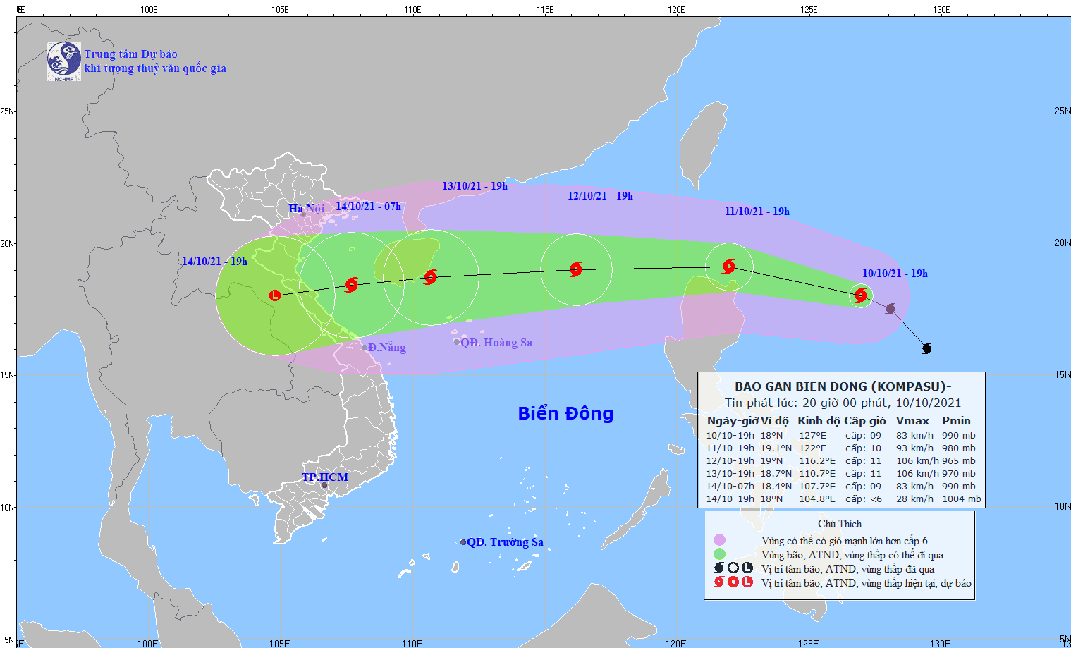 Đến 13 giờ ngày 11.10, vị trí tâm bão số 8 Kompasu ở khoảng 19,1 độ Vĩ Bắc; 123,5 độ Kinh Đông, cách đảo Luzon khoảng 160km về phía Đông Bắc. Sức gió mạnh nhất vùng gần tâm bão mạnh cấp cấp 9-10 (75-100km/giờ), giật cấp 12.